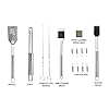 PRODUCT DETAILS- 16 piece set includes essentials like swiss knife, spatula, tongs, basting brush, cleaning brush, corn holders and skewers. Spatula has built in bottle opener. Material: Stainless Steel with heat-safe handles. Dishwasher Safe.