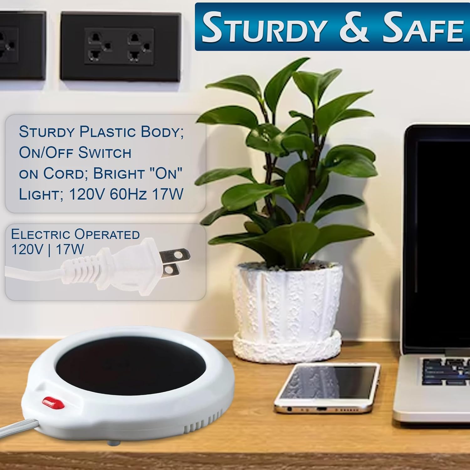 STURDY & SAFE – Sturdy Plastic Body; On/Off Switch on Cord; Bright “On” Light; UL listed 120V 60Hz 17W