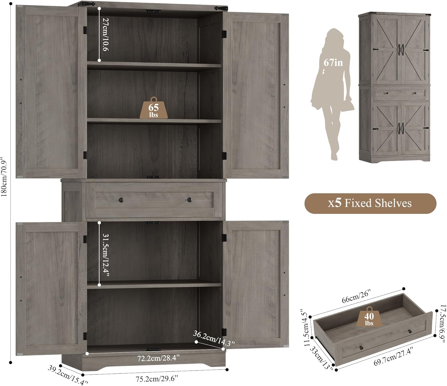 Color: Ash Grey Overall Dimensions: 15.43″D x 29.6″W x 70.87″H Overall Capacity: 450 lbs What‘t in the box: 1 x 71″ Kitchen Pantry Cabinet ; 1 x Step-to-Step Instruction ; 1 x Accessories Bag