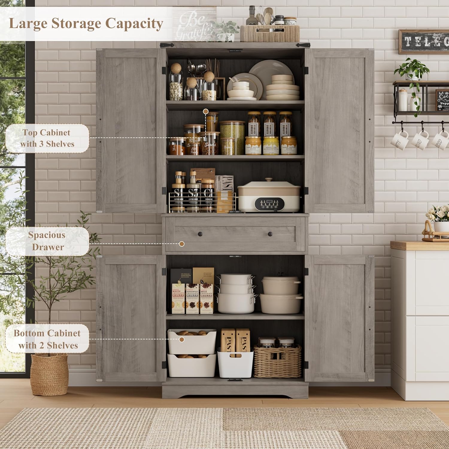 HOSTACK 71″ Tall Pantry Cabinet, Farmhouse Kitchen Pantry with Storage Shelves, Barn Doors Food Storage Cabinet, Freestanding Kitchen Hutch with Large Drawer for Dining Room, Living Room, Ash Gray