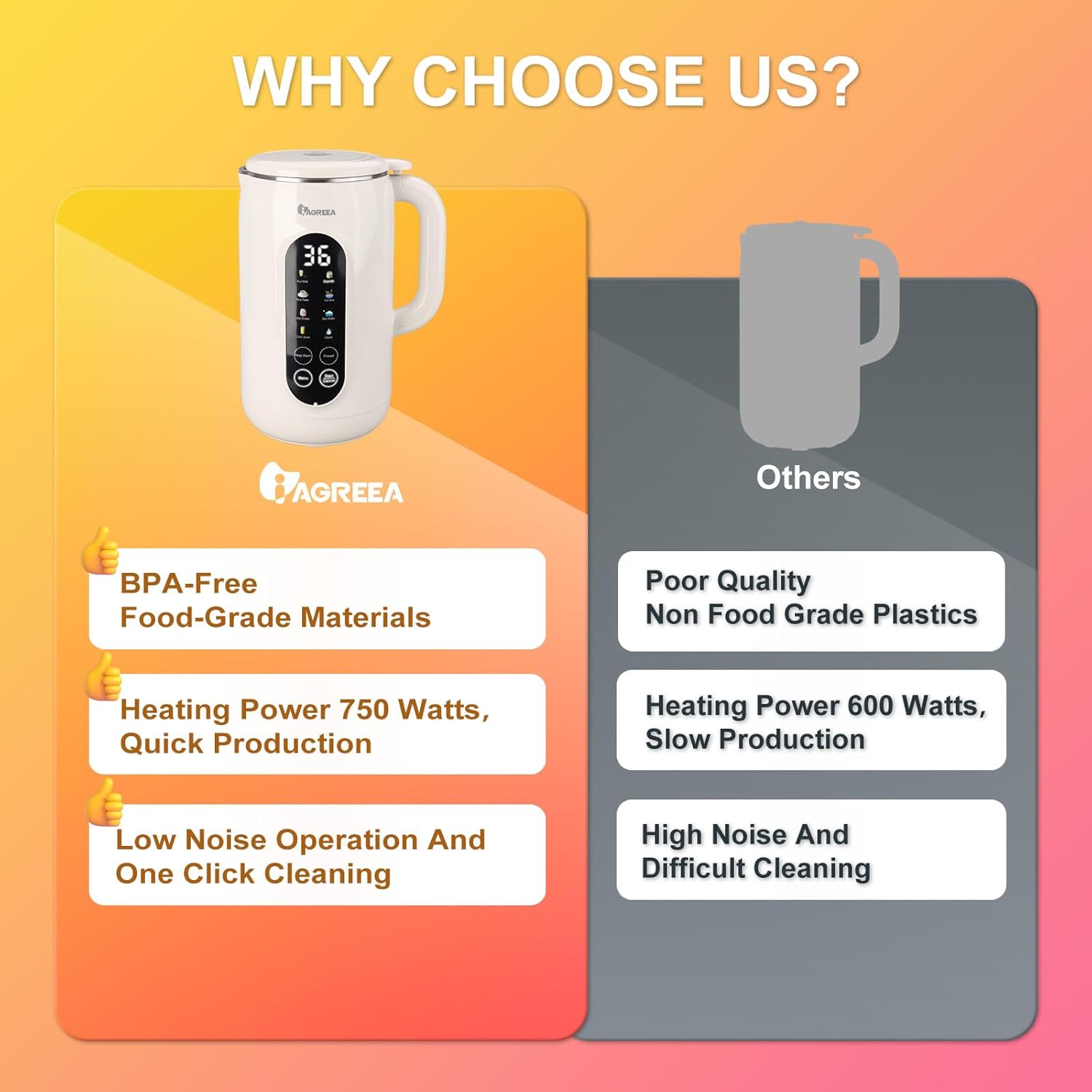 One-Touch Operation: Automatic heating and filtering-free design–No need to soak ingredients in advance, just add ingredients, press a button, and enjoy fresh soy milk in 36 minutes.Both hot and cold drinks can be made through different programs.