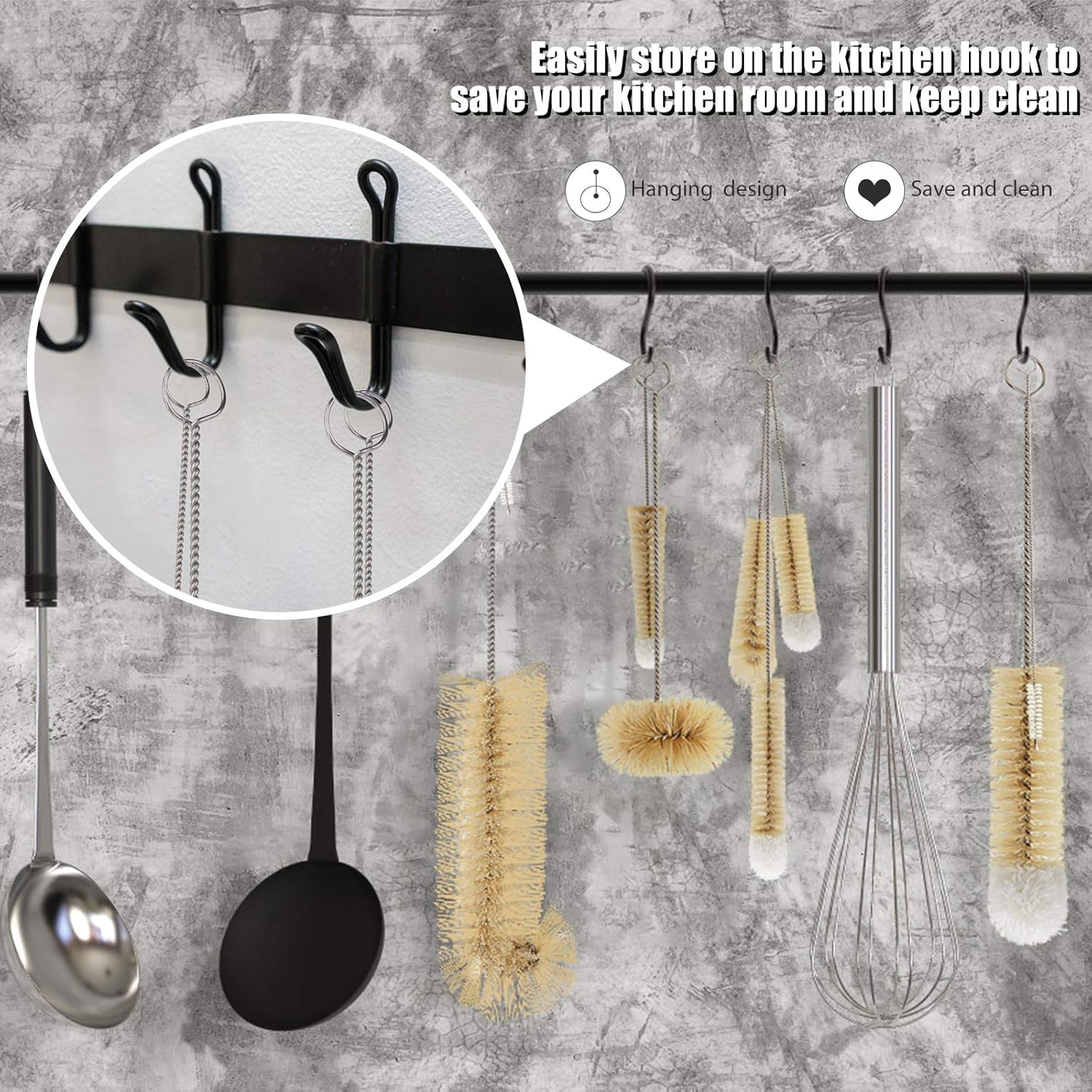 【Convenient Storage】: Each cleaning brush is equipped with a ring for easy storage. You can store them on the walls at kitchen, bathroom or keep in the cabinets, drawers, when you do not use. You can rinse bottle brushes with warm soapy water after each use to make them last longer, are easy to clean.
