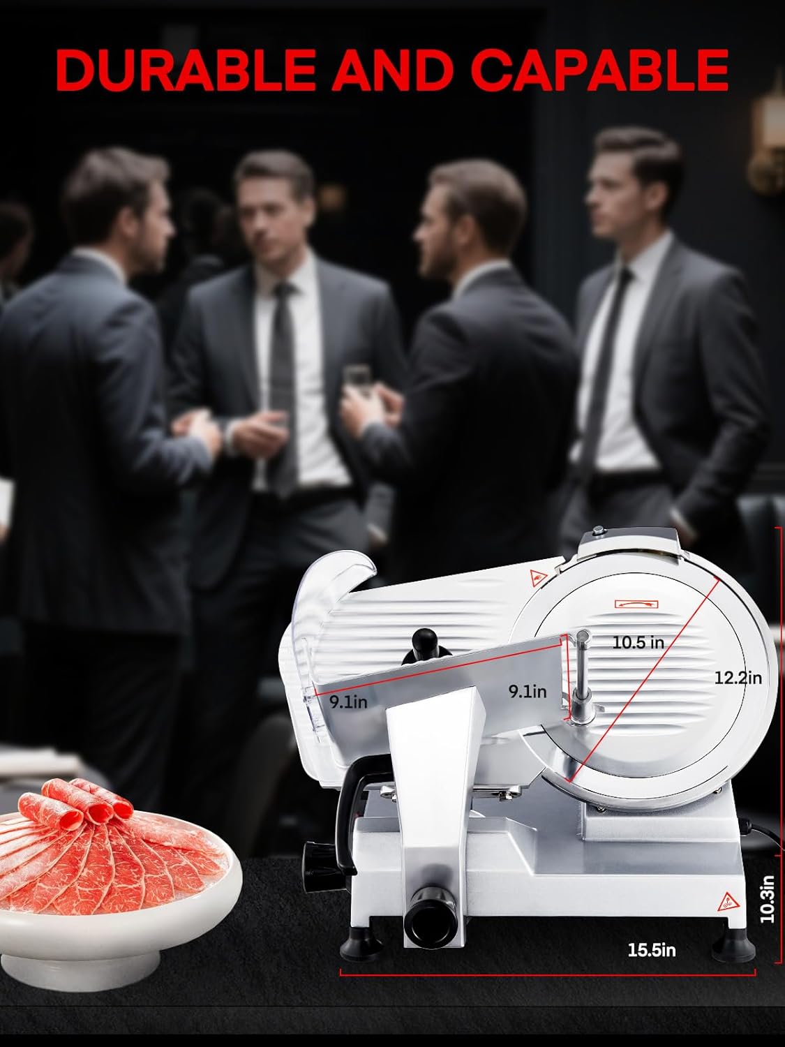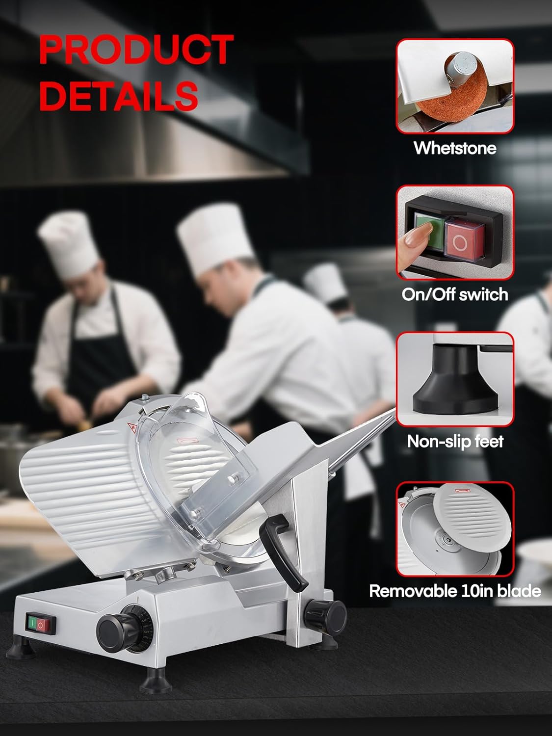 Wide range of uses: Our slicers can be used to cut meat, cheese, turkey breast, bread, vegetables, fruits and other foods. (Note: Fresh meat needs to be frozen before cutting, hard cheese, bread, vegetables, etc. can be cut, soft foods need to be frozen before cutting.) Suitable for home or commercial use, such as kitchens, restaurants, butcher shops, canteens, etc.