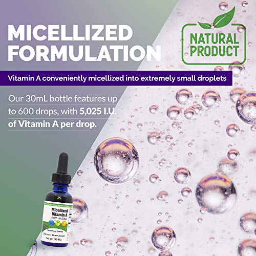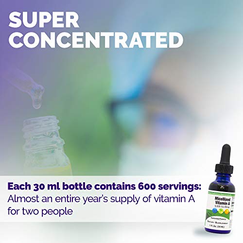 Super Concentrated – One drop supplies 1,057mcg RAE which is equivalent to 5,025IU of Micellized Vitamin A. Each 30 ml bottle contains 600 servings. Each serving is 5,025 IU; That’s almost an entire year’s supply of vitamin A for two people