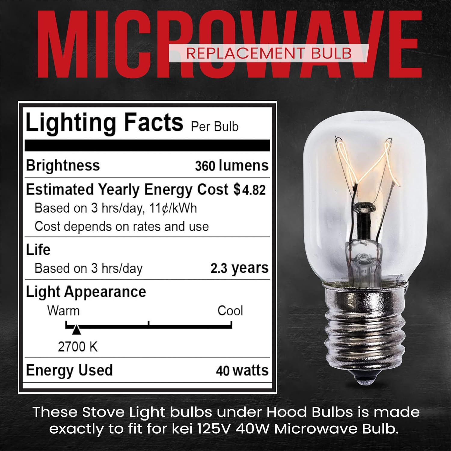 EASY TO INSTALL: These Stove Light bulbs under Hood Bulbs is made exactly to fit for kei 125V 40W Microwave Bulb. These are replacements Compatible with most top name Brands and Fit Whirlpool, GE, Kenmore, LG, Amana, Maytag, KitchenAid, Magic Chef, Estate, Jenn-Air, Roper, Caloric, Hardwick Microwave Bulbs.