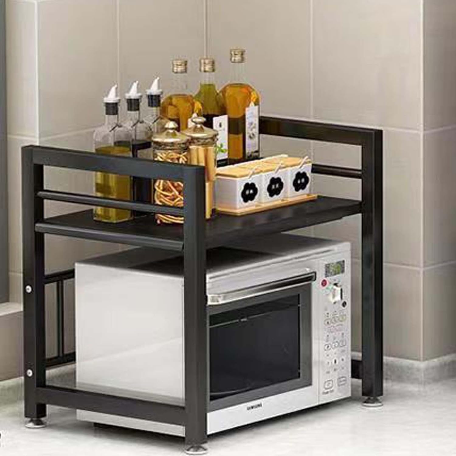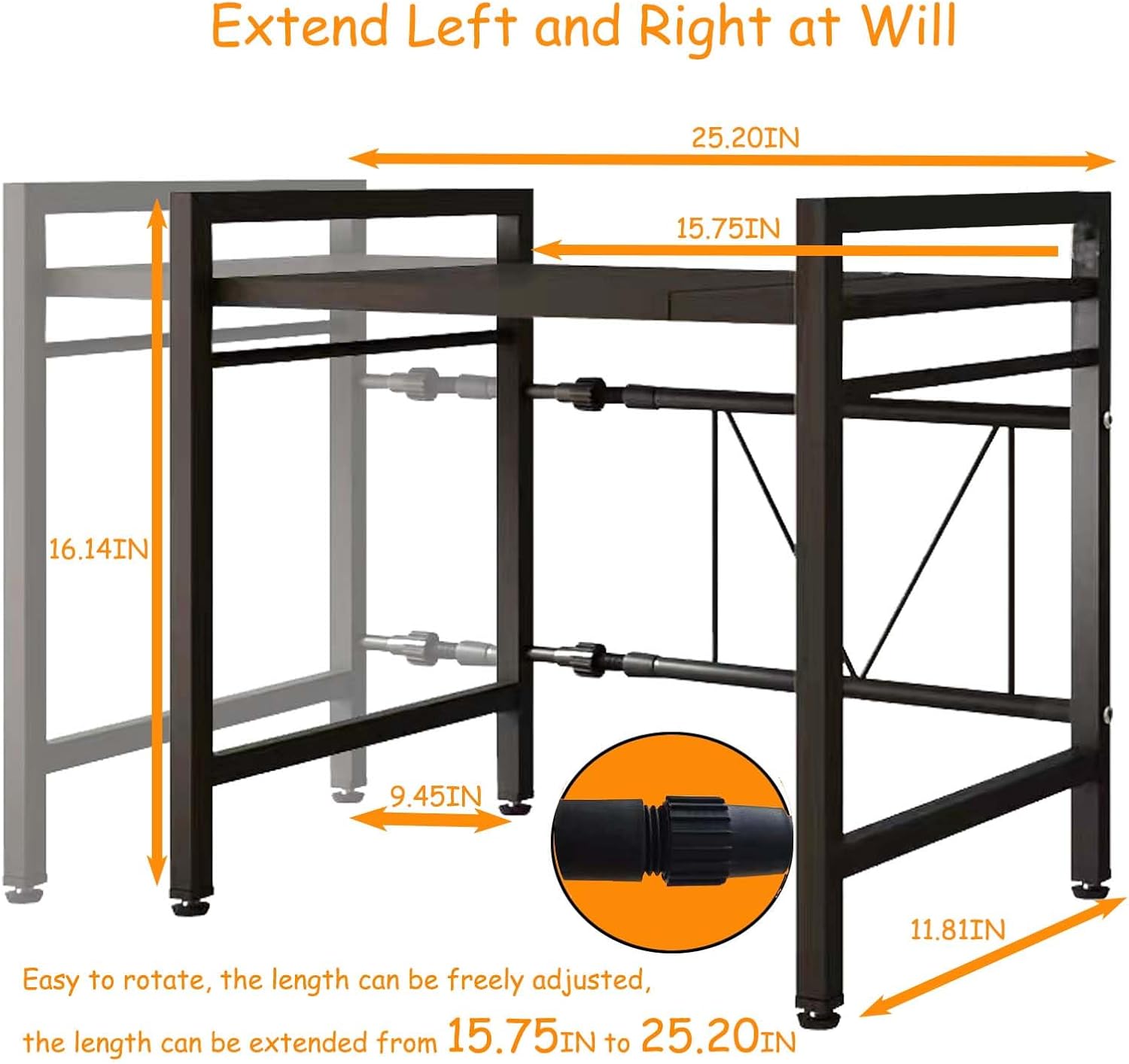 Expandable Length and Height;The length and height of this microwave shelf can be adjusted according to your needs, which is convenient for storing microwave ovens or other kitchen utensils, so as to make better use of kitchen space.