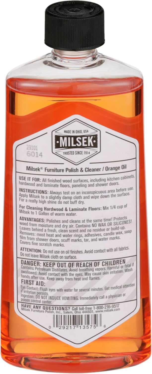 Milsek Orange Furniture Polish and Cleaner rejuvenates and protects your wood all in one easy step. Slightly dampen a soft microfiber cloth and apply Milsek before wiping down your wood surface. This application method allows for controlled use, unlike multi-purpose cleaners in a spray bottle or aerosol spray. To use as a wood floor cleaner, pour a small amount into a bucket of water and mop laminate or hardwood floors like you would with another hard surface cleaner. Milsek furniture cleaner removes smudges, grease, and grime to restore your wooden furniture to its natural luster. Made with no damaging wax or silicone, this orange oil cleaning product is safe for daily use without leaving behind harmful build-up. Orange furniture polish can be used on all wood products, including cabinets, hardwood floors, paneling, wicker and rattan furniture, and fine furniture. Milsek Orange Oil Polish can remove scratch marks and water/heat rings to revitalize your wood finish, whether you have dark wood or light. Milsek Lemon Oil Furniture Polish (lemon scent), Milsek Holiday Scented Wood Furniture Polish, and Stainless Steel Cleaner are also available.