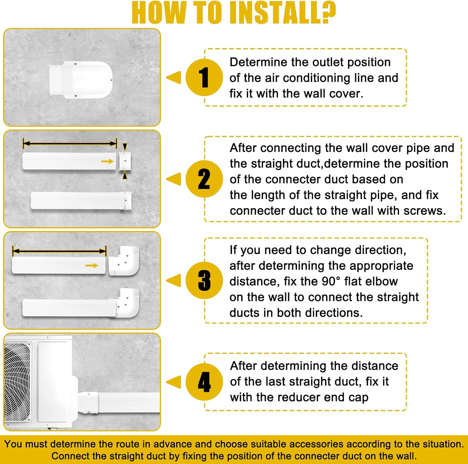PACKAGE INCLUDE: mini split line set cover include 5 pcs straight mini split wall cover, 4 pcs connecter ducts, 1 pcs flexible duct, 1 pcs wall cover, 1 pcs reducer end cap, 1 pcs 90° elbow, 1 pcs 90° flat elbow.