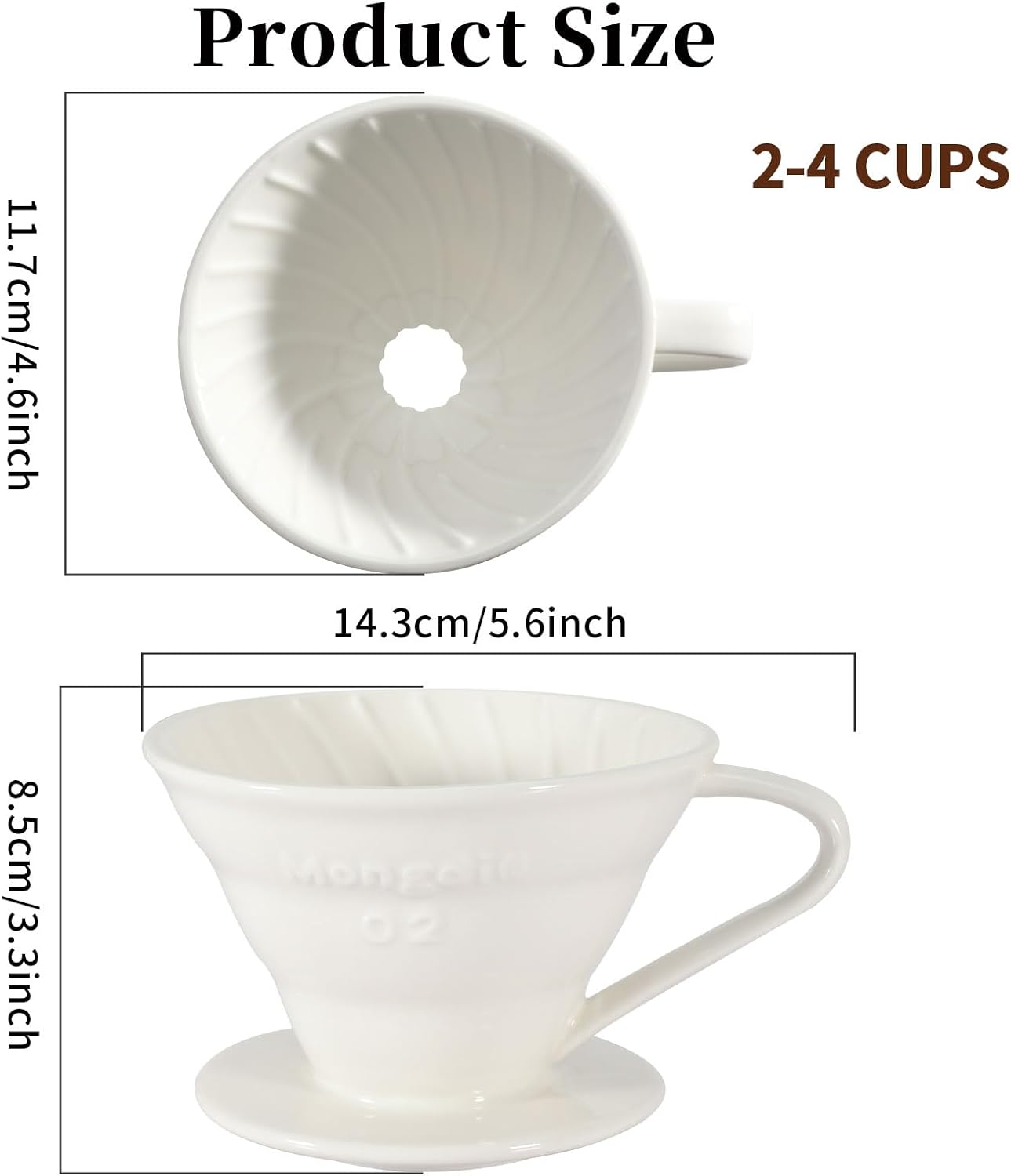 Mongdio V60 Ceramic Pour Over Coffee Dripper, Reusable Porcelain Portable Pour Over Coffee Maker, Slow Brewing Accessories with 1 Holes for Home – Size 02 White