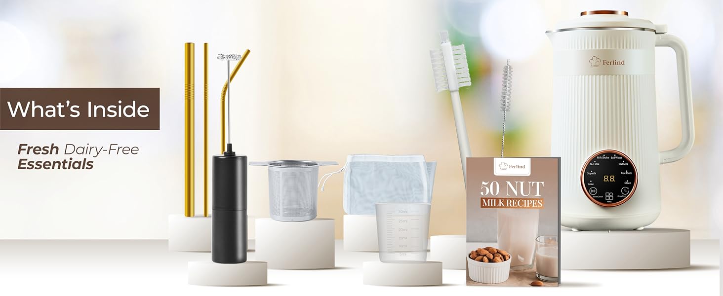 [Complete Nut Milk Maker Bundle] Get more value with the Ferlind Nut Milk Maker bundle, which includes a mini milk frother, three gold reusable straws with a cleaning brush and mini pouch, a recipe book, a cleaning brush, a stainless steel strainer, a nut milk bag, and a measuring cup. Enjoy a comprehensive set of tools for creating a variety of delicious and healthy drinks.