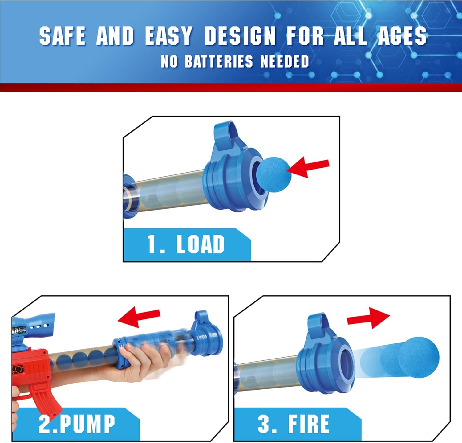 Pump Action Toy Gun – This ball popper toy is easy to fill, easy to fire: load the balls, then pump the handle back and forth to shot your targets. The very-light-weighted sponge balls do no damage to their targets — household items, and people, even the kids can battle friends with the foam balls.