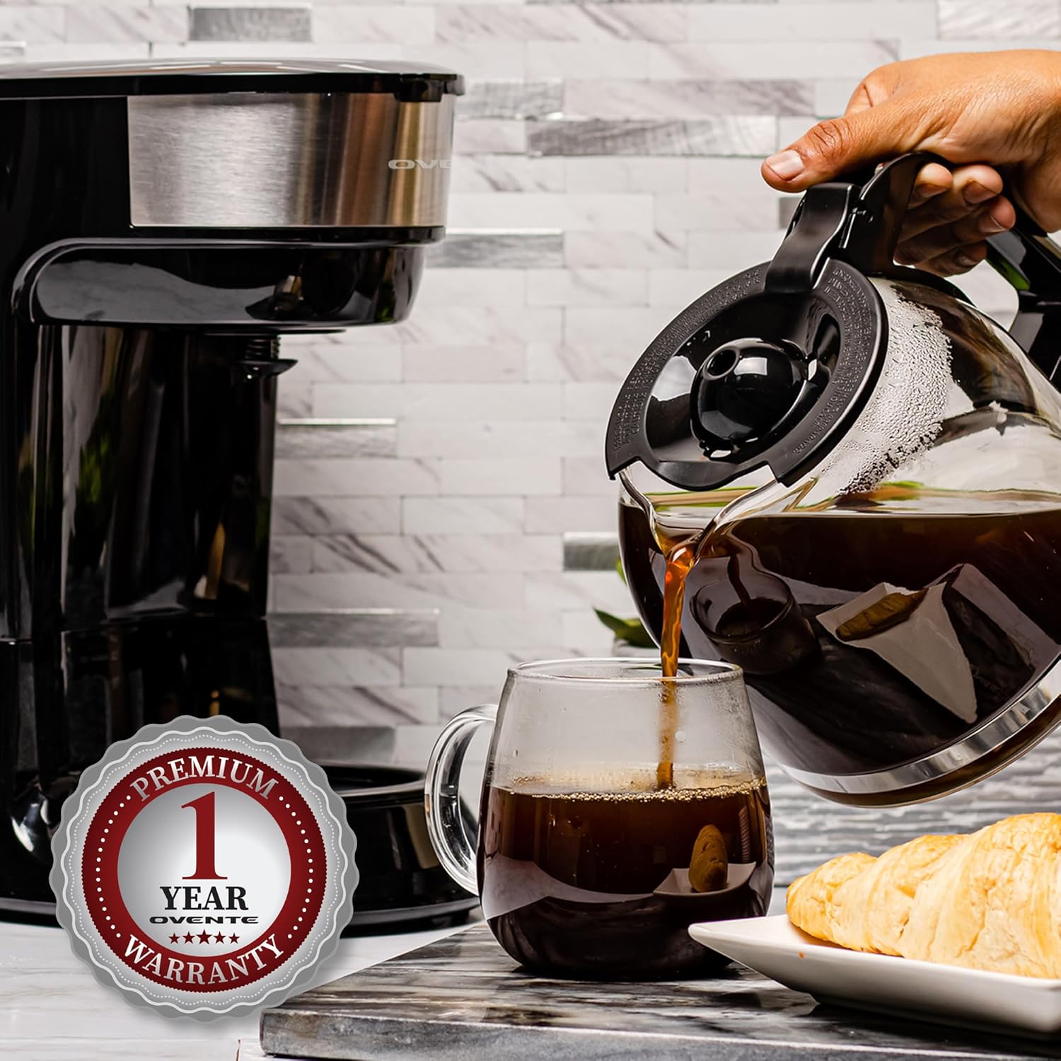 OVENTE 12-Cup Drip Coffee Maker with Borosilicate Glass Carafe, One-Touch Operation Machine, Anti-Drip System, Reusable Filter and Clear View Water Level Gauge, Ideal for Home or Office, Black CM412B