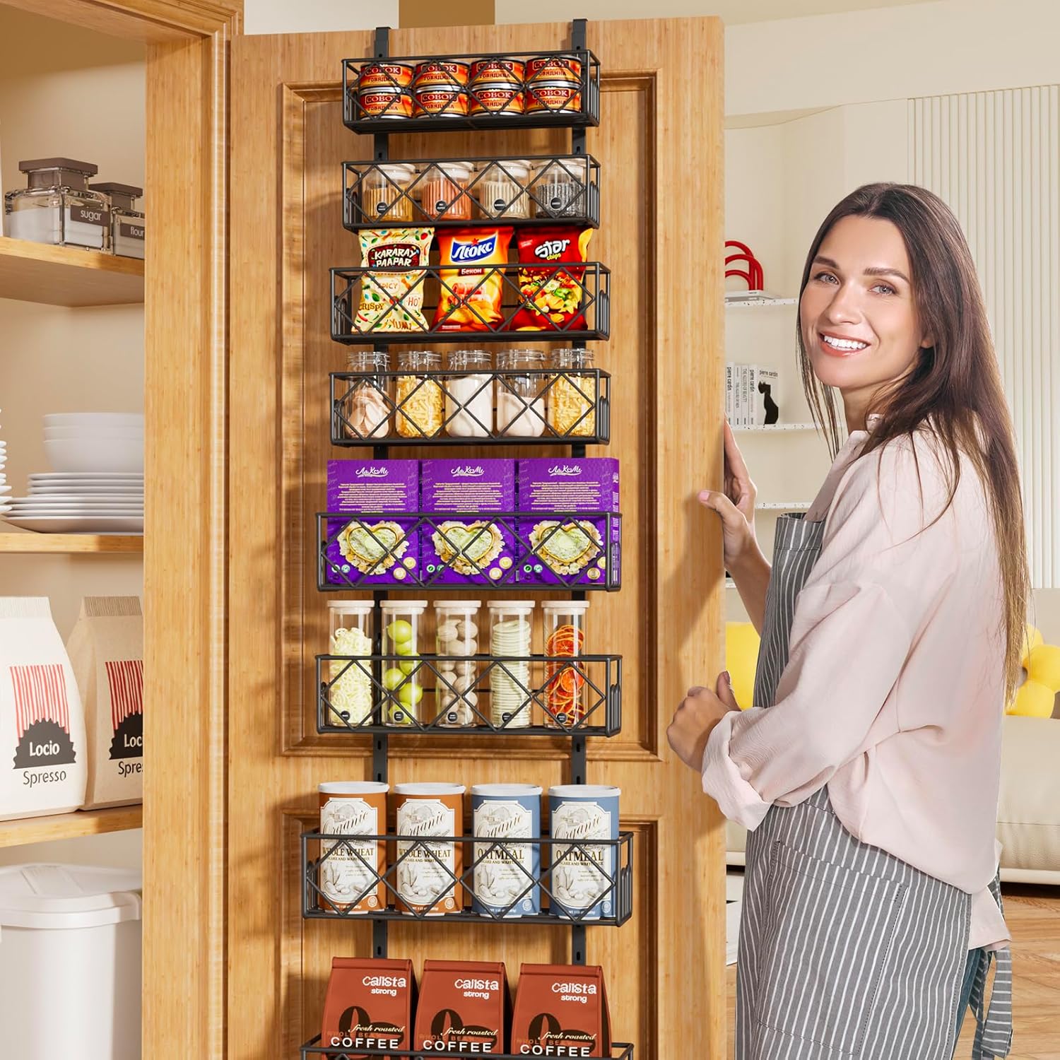 MULTI-PURPOSE DOOR STORAGE RACK- Our hanging pantry organizer can be used for various purposes such as pantry shelf organizer, bathroom cabinet door shelf, can/bottle rack, snacks organization, and more. A versatile solution for maximizing your space in any room of the house.