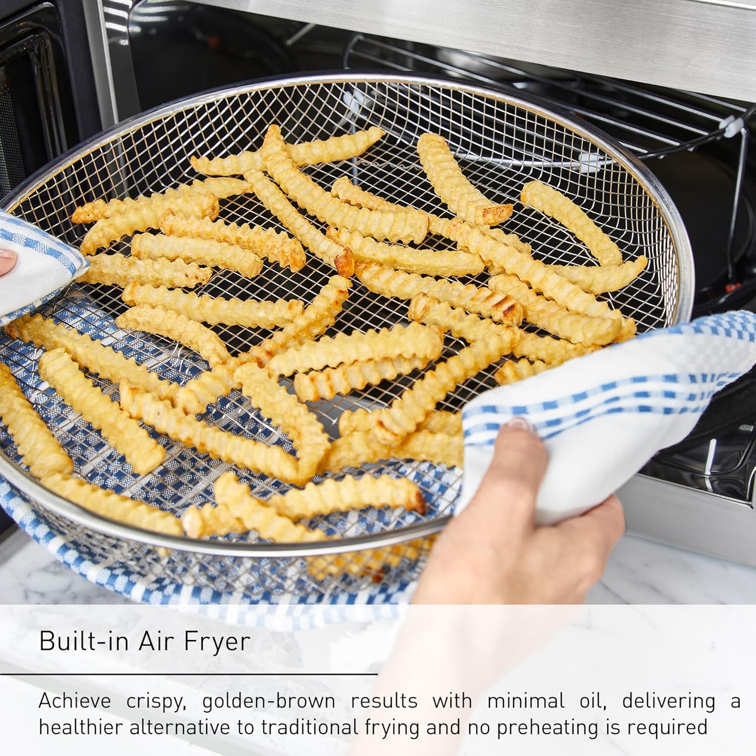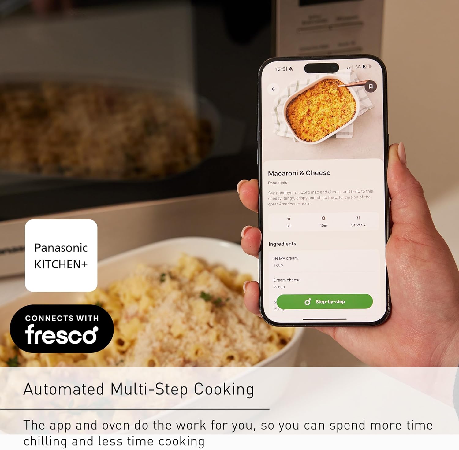 Mealtime Simplified, Powered by Our App: Pick your dish from the Panasonic Kitchen+ app, gather ingredients, and pair your phone with the oven; the built-in modes of microwave, broiler, airfryer, and convection oven automate to help you create perfectly-cooked meals with little effort