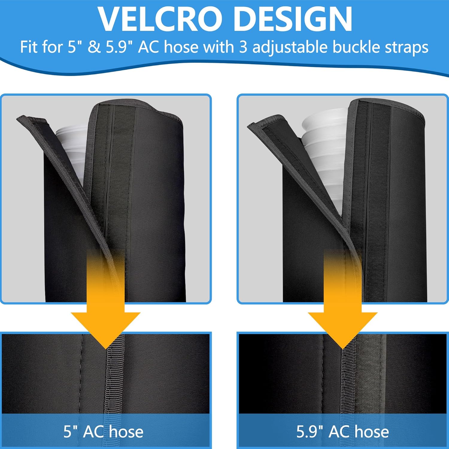 【EASY INSTALLATION】Just take a few mins to put this sleeve on your portable air conditioner hose. Please follow this instruction: 1. Remove hose from portable AC and stretch hose. 2. Wrap the hose with hose insulation sleeve through magic velcro. 3. Put the elastic band on both ends. 4. Attach warpped hose to ac and fasten with elastic buckle band.
