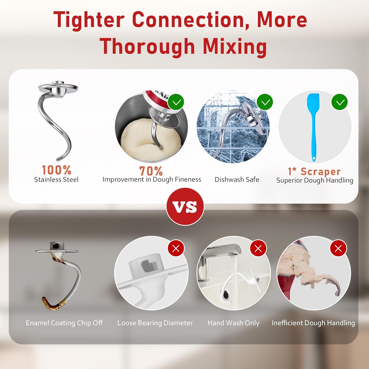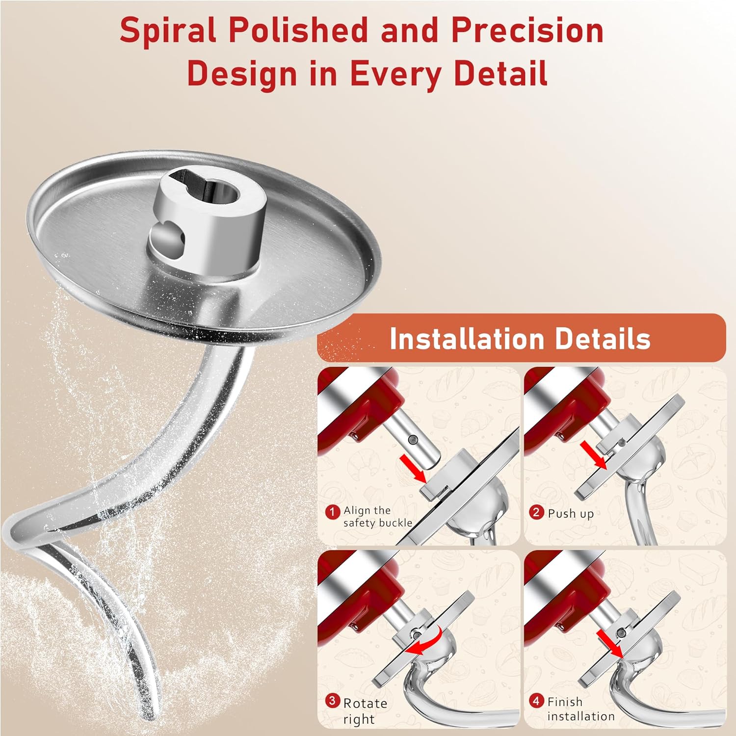 MIRACLE POLISHED STAINLESS STEEL & 0 FOOD WASTE & ANTI-SHAKING DESIGN: Premium hand-polished stainless steel KitchenAid Dough Hook for stand mixers eliminates paint peeling, chipping and dough buildup. The ultra-smooth, mirror-polished surface reduces dough leftovers by 90%, ensuring waste-free mixing every time. Pro safety buckle and the dough hook‘s circular head structure prevents vibration and wobbling when mixing heavy dough. With a dynamically balanced design, it provides 100% more stability during high-torque mixing