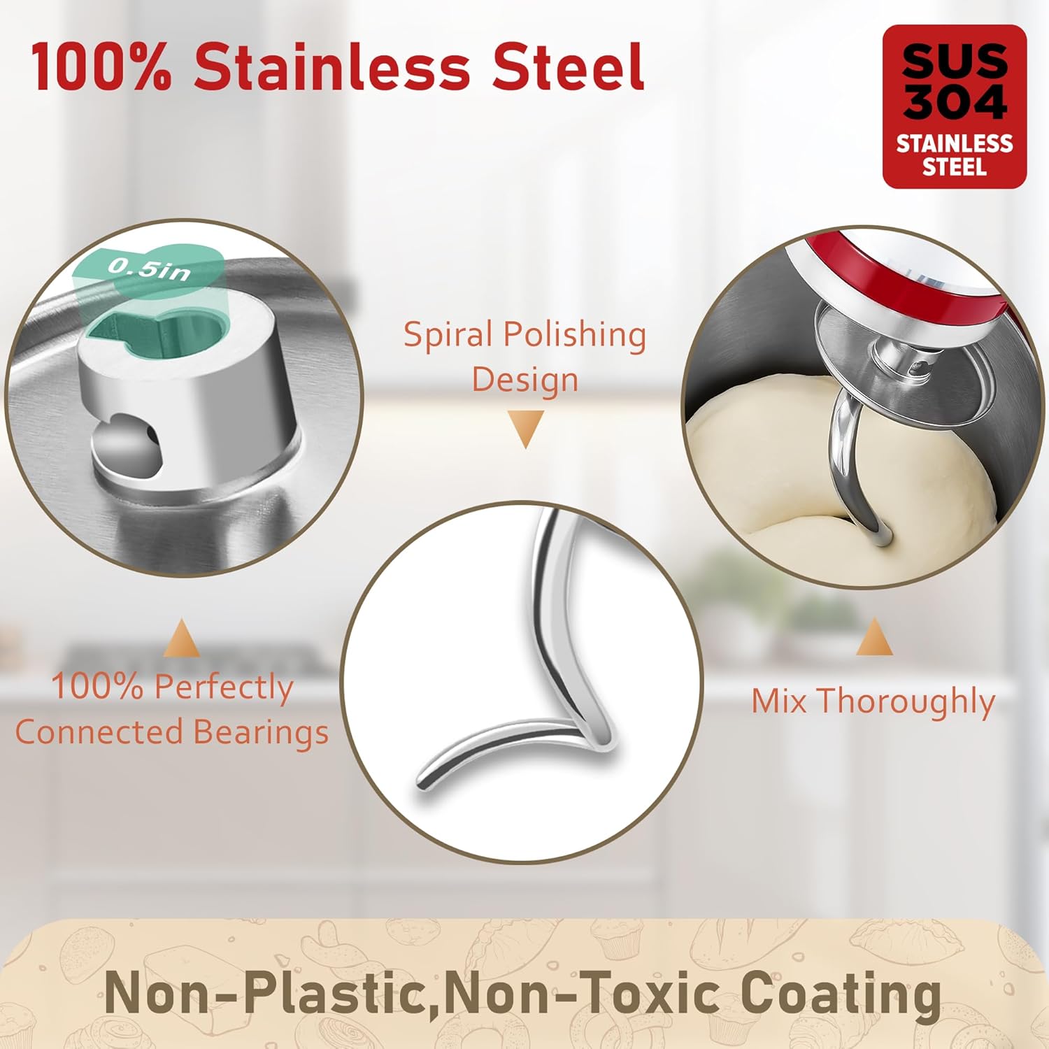 DIE CASTING & DURABLE & DISHWASHER SAFE: This stainless steel kitchenaid dough hook attachment is made with a high-strength die-casting process and seamless welding, ensuring exceptional durability and long-term stability. It automatically balances and regulates the heat of the dough, easily handling thicker and denser doughs. The 5-layer metal crystal structure resists tarnishing and wear, extending its lifespan. The 6qt dough hook kitchen aid is 100% eco-friendly, reducing resource consumption, it’s dishwasher safe, saving you time and effort