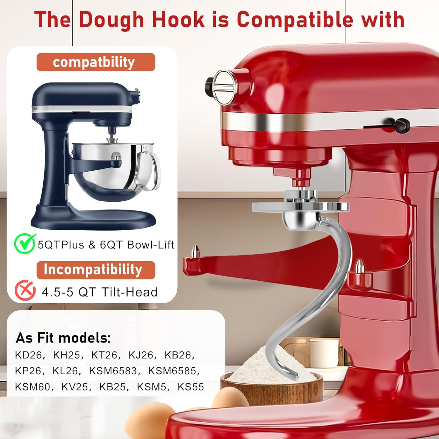 PERFECT COMPATIBILITY: 6qt kitchen aid dough hook is CNC precision machined for 99.9% interface fit, designed for KitchenAid 5plus-6qt bowl lift mixers, fits Professional 5 Plus Series, Pro 500 Series, Professional HD Series, Professional 600 Series and Pro 600 Series, such as KV25G0X, KV25G8X, KV25H0X, RKG25HOX, KV25M, KP2671X, KP26M1X, KP26M8X, KP26M9X, KP26M9PC, KP26N9X, KP2671X, KL26M1X, KL26M8X, KD2661X, KT2651X, KT2651X, KB26G1X, RKSM6573ER, RKSM6573ER, RKSM6573CU, 5KSM6583, 5KSM6585G etc(not compatible with KitchenAid tilt head mixers)