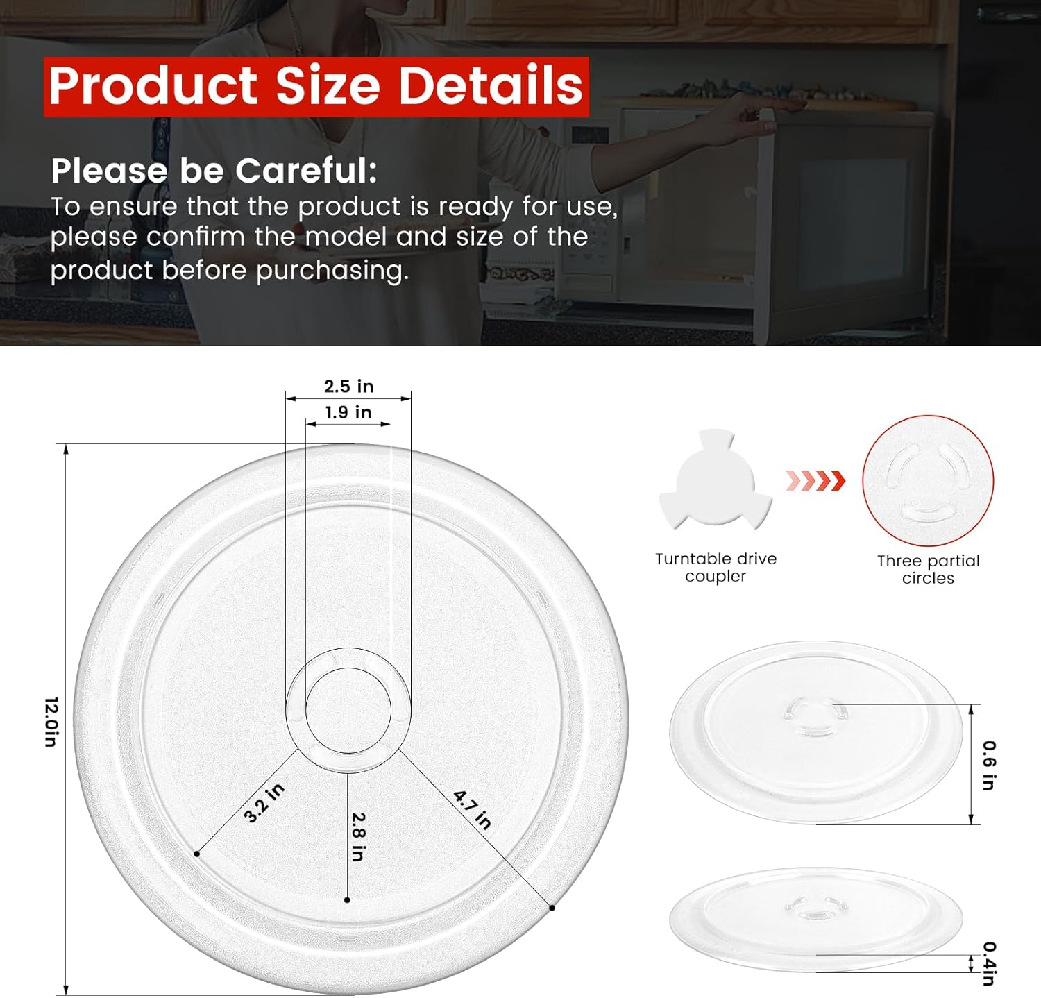 【𝗘𝗫𝗖𝗘𝗟𝗟𝗘𝗡𝗧 𝗗𝗘𝗦𝗜𝗚𝗡】–4393799 microwave glass plate high temperature resistant and thickened design, high temperature resistance, does not hurt hands, and is safer to use and more secure.The front of the glass tray is frosted design, and the reverse side is irregularly convex, which has a double-layer non-slip effect.As well as the three-part round structure that is not easy to break, can prevent the glass tray and the rotating circle from sliding each other, making food heating more uniform.Warm Note : The bottom of our microwave glass turntable plate connected to the turntable drive coupler is a circle, and other models are Y-shaped, please check carefully when buying