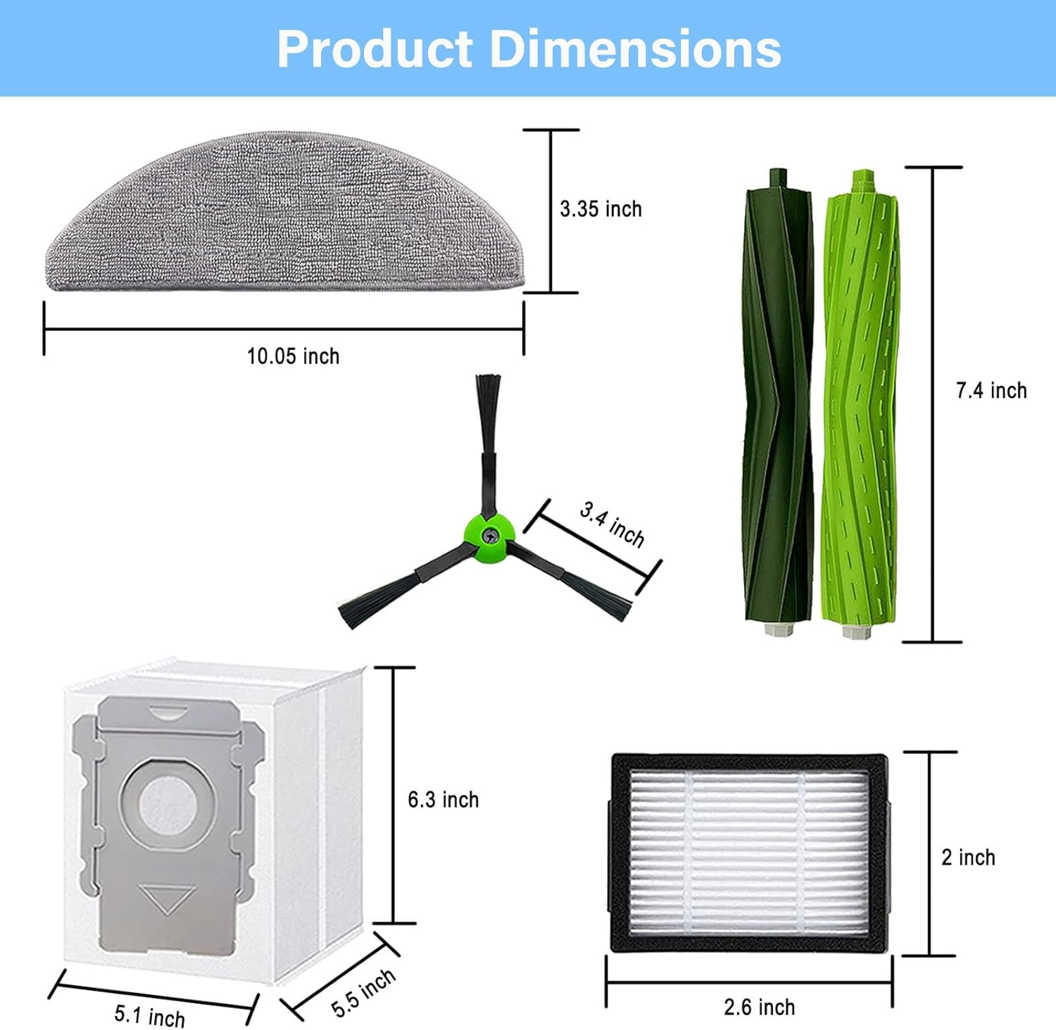 Valuable Package: Includes 1 Set of Multi-Surface Rubber Brushes, 4 Pack Filters, 4 Pack Mop Pads, 4 Pack Vacuum Bags, 4 Pack Side Brushes, 1 Pack Cleaning Tools, 1 Pack Screwdriver