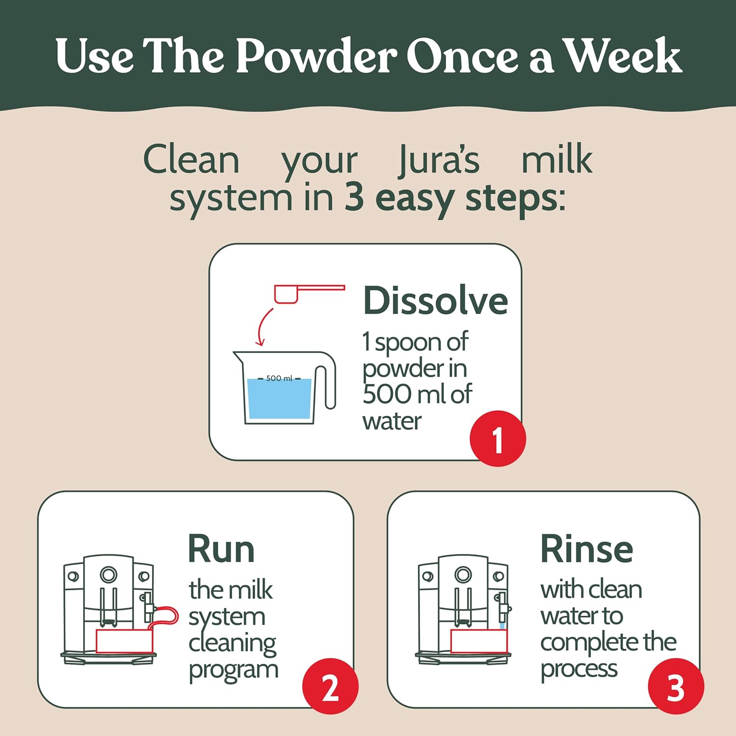 INCREASES LIFE OF MACHINE – The use of Jura Milk System cleaning powder not only improves the taste of your coffee, but it also extends the life of your machine. Avoid clogs on your Jura espresso machine.