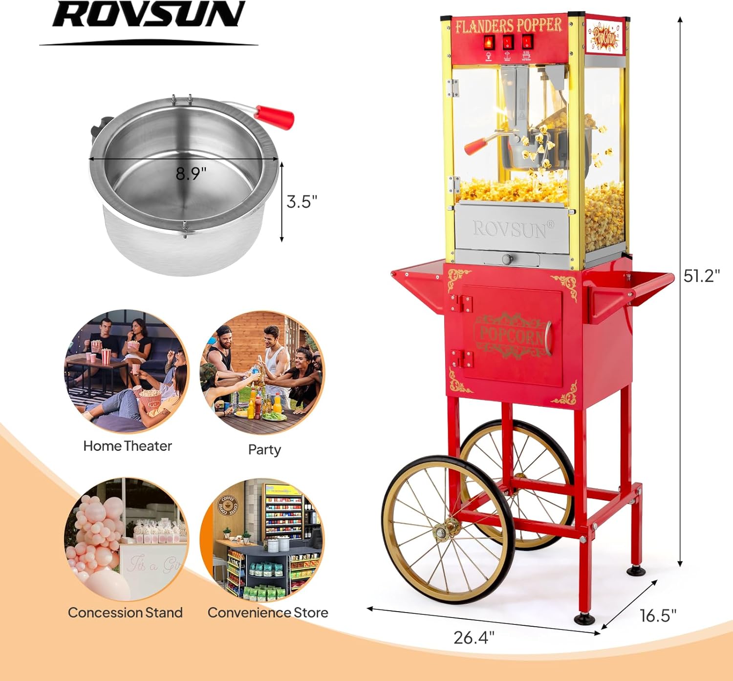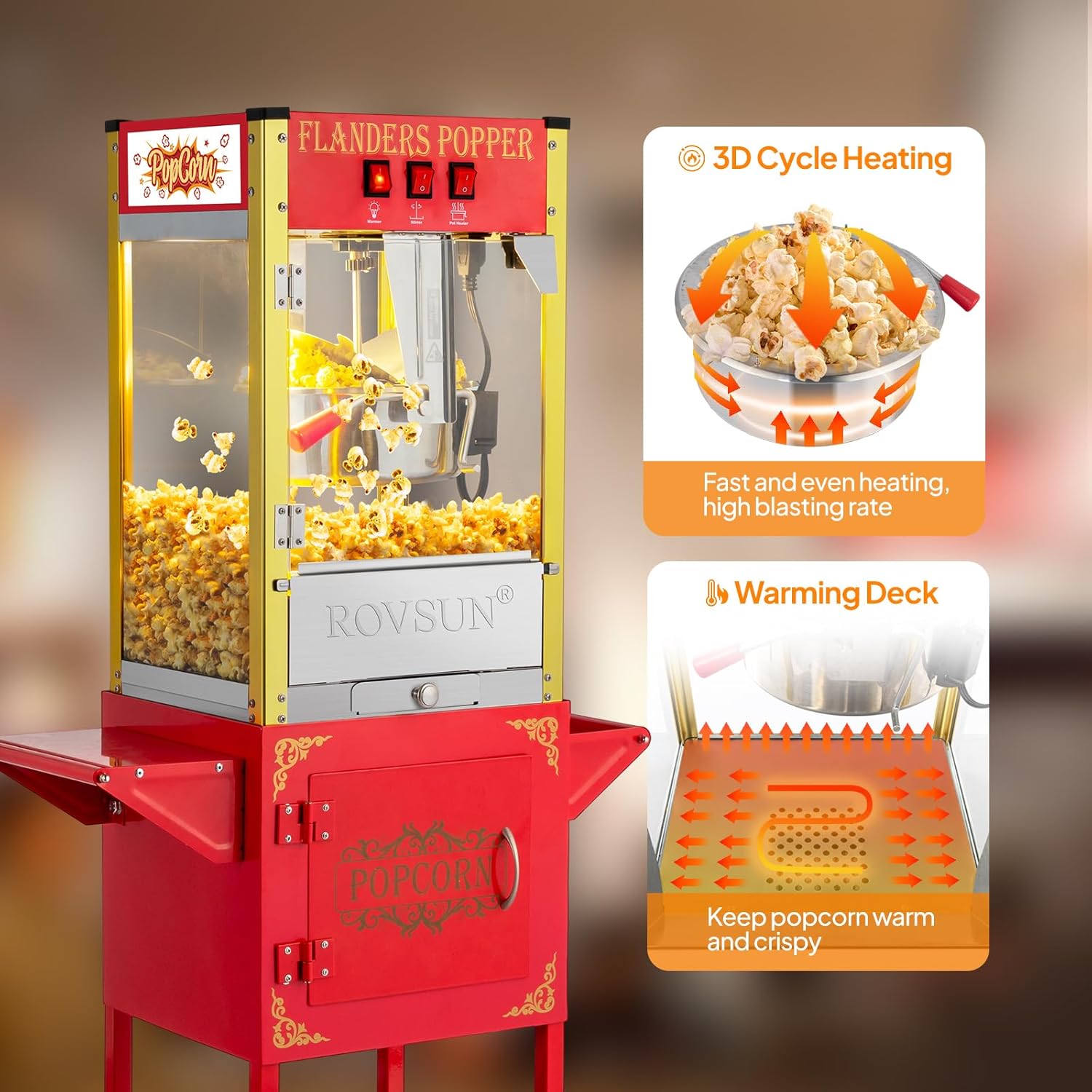 WHEELS FOR MOBILITY: The popcorn machine comes with a cart with 2 wheels for easy mobility. What’s more, the cart is designed with a storage compartment for storing accessories and other small items needed for making popcorn