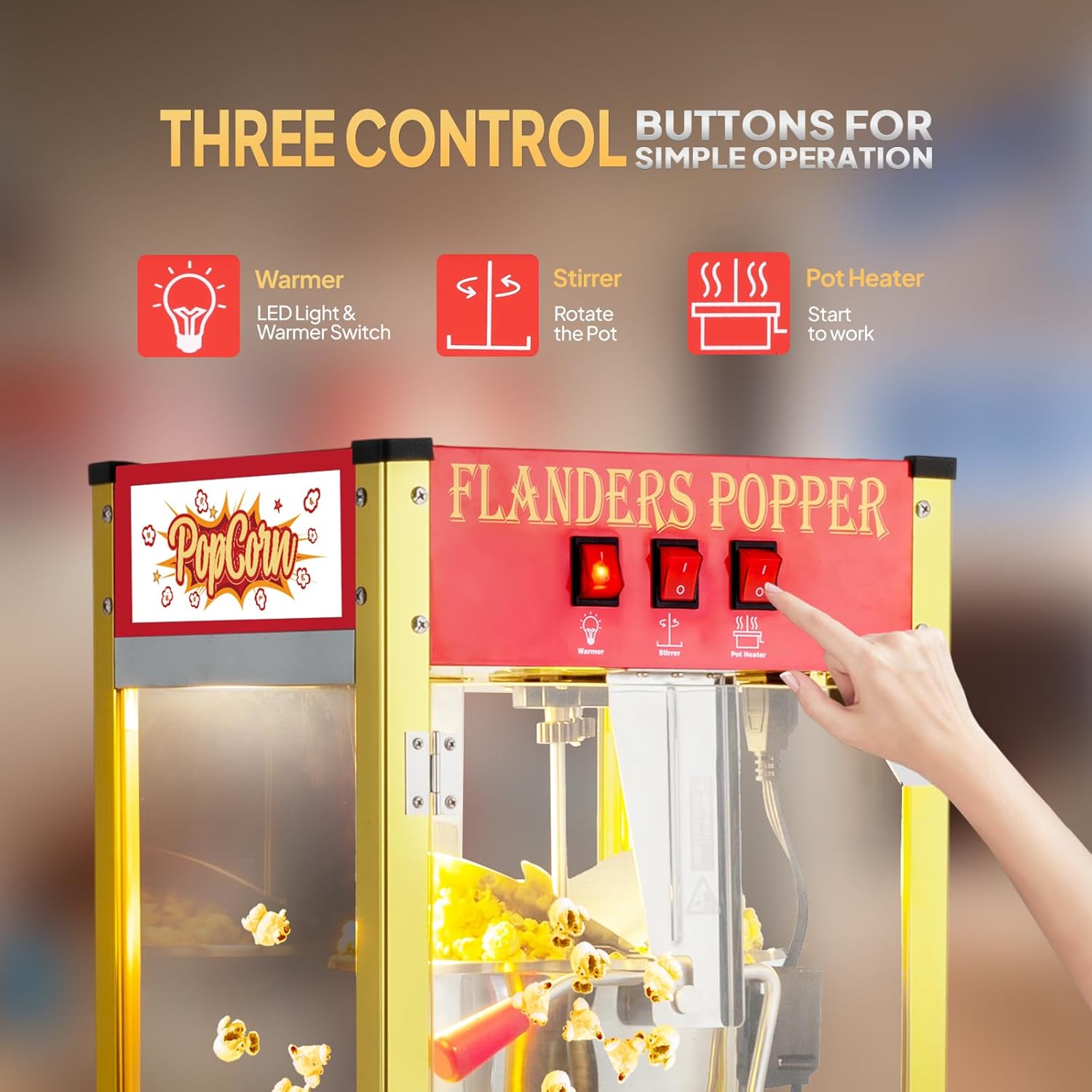 3 CONTROL SWITCHES: The popcorn maker machine is designed with 3 control switches for controlling the warmer, stirrer, pot heater separately, which makes the operation more convenient. Besides, it is designed with an interior LED light for providing a clear view and also creating a movie theater atmosphere
