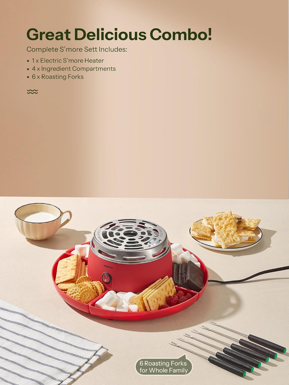 Reemix S’MORES KIT: This indoor smores maker comes with a flameless heater, 4 detachable compartments for easy sharing & serving, 6 roasting forks suitable for more people to enjoy the fun of S’more.