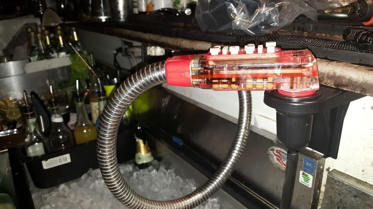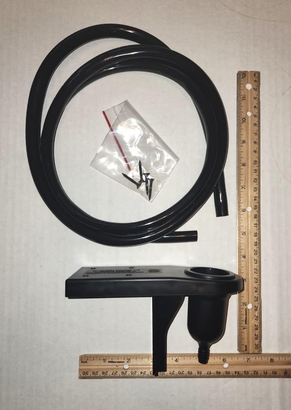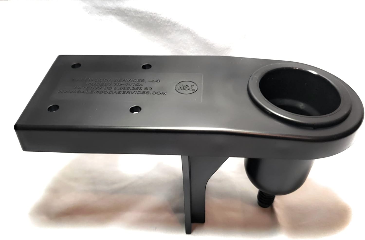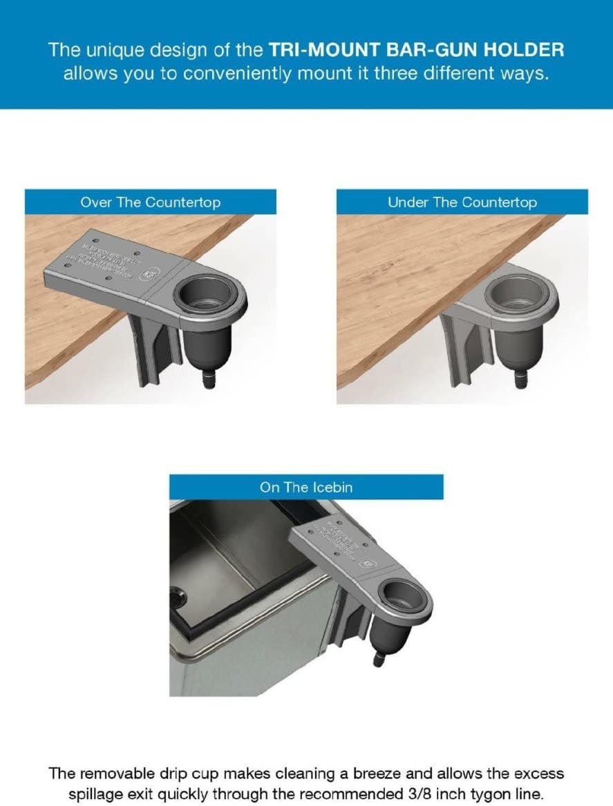 Quickly and easily secures ALL SIZES OF SODA GUNS the first time when placed in the Tri- Mount holder. Freedom to position your soda gun any way you want, NO LOCKED position for easy and fast hand movement behind the bar. Securely fastens ABOVE OR UNDER THE BAR top and to ICE BIN, giving business owner multiple mounting options to save on space while providing a clean appearance. Drip cup is closed and drains excess syrup drips easy (NO CLOGGING UP, NO fruit Flies), using an extra smooth 3/8 wide and 5 feet long drain line to provide a sanitary bar area. TRI-MOUNT HOLDER is PATENT and NSF APPROVED, two piece design is superior to anything in the current market. Closed concept drip cup is not exposed to air, prevents excess syrup spillage causing mold and condensation damages to bar tops. DRAIN OUTLET IS CENTERED vertically in the bottom of the drip cup, allowing spillage to flow freely down the 3/8 wide drain opening. Drip cup TWIST AND LOCK effortlessly for ease of removal and cleaning. Made in the USA completely out of durable ABS plastic (NO Rubber, NO Mold).