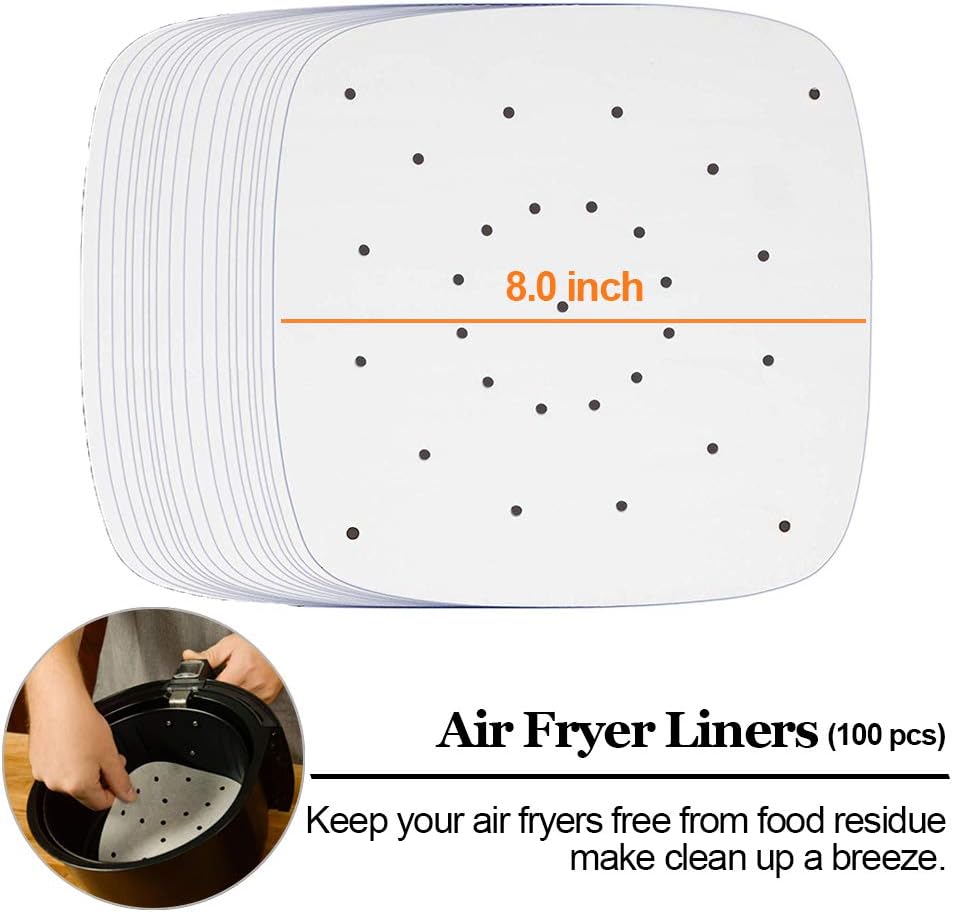 Include What You Need – 8” Pizza Pan, 8″ Square Cake Baking Pan, 8” Multipurpose Skewers Rack, 7.5” Metal Holder, Toasting Rack, Food Tongs, 8” Air Fryer Liners (Perforated Parchment Paper), Silicone Oil Brush, Pan Gripper, 7” Silicone Mat, Egg Bite Molds. And the air fryer Recipe Cookbook