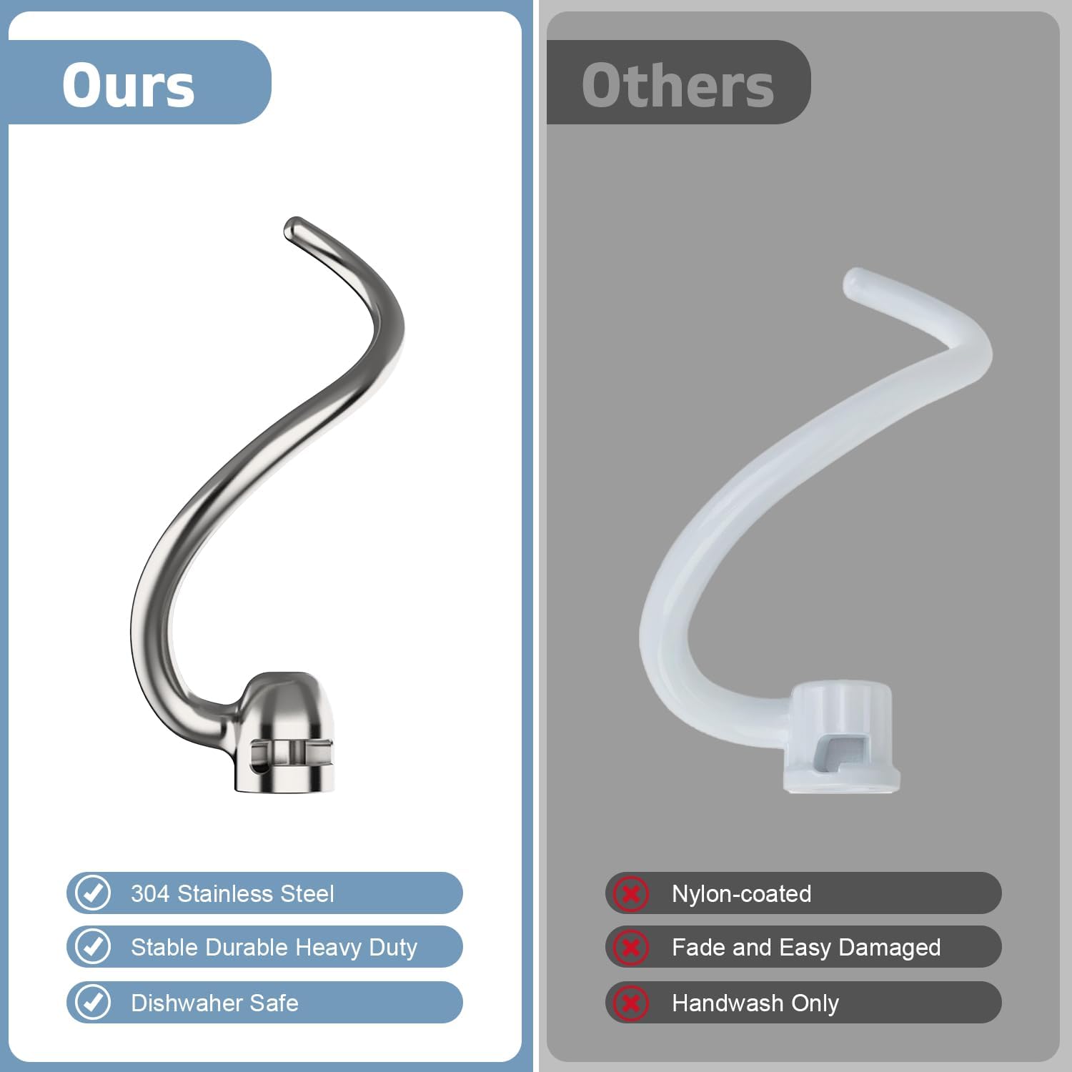 【Premium Stainless Steel】Crafted from high-quality stainless steel,the dough hook attachment is built for long-lasting durability. Its sturdy design ensures reliable performance, and it’s easy to clean and maintain.