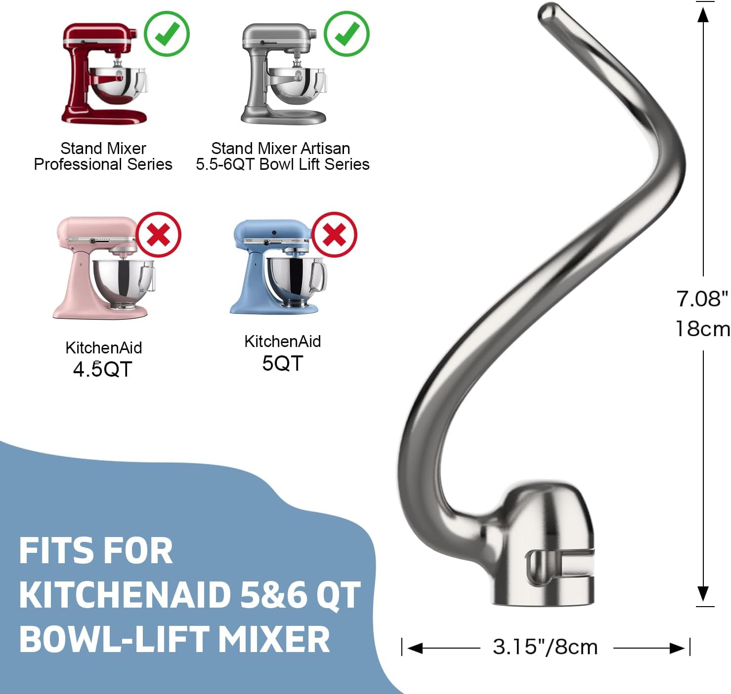 Stainless Steel Dough Hook for KitchenAid 5QT-6QT Bowl-Lift Stand Mixers, Fits Professional 5 Plus, Pro 600 Series, KV25, KP26, Dishwasher Safe