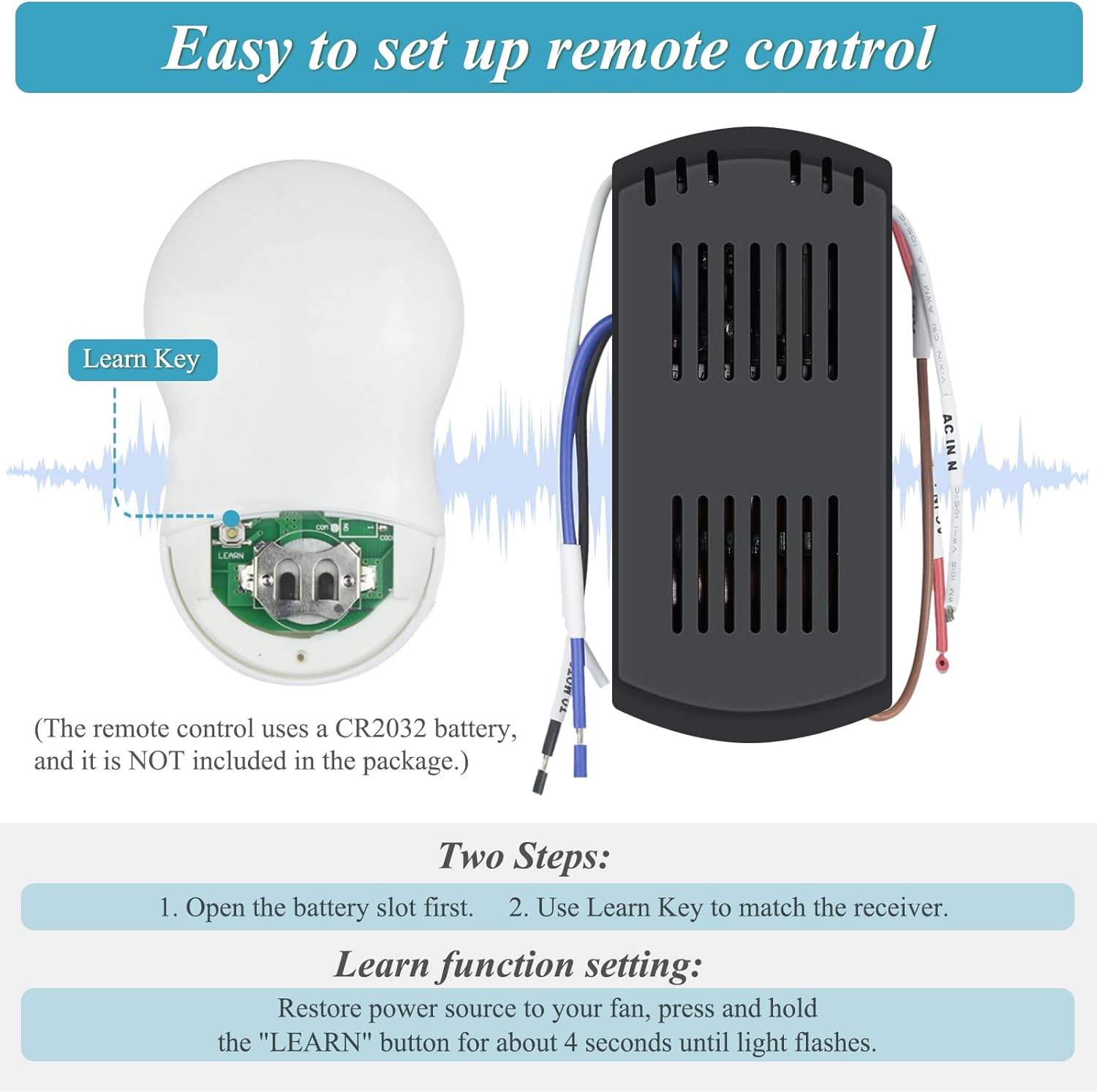 Easy Install — Installation of the ceiling fan remote kit is very easy and fast. Please set the frequency combination of transmitter & receiver at the same pattern. It has a LEARN key that allows it to match more type of receivers. And please follow the Instruction of Installation and Operation to install it.