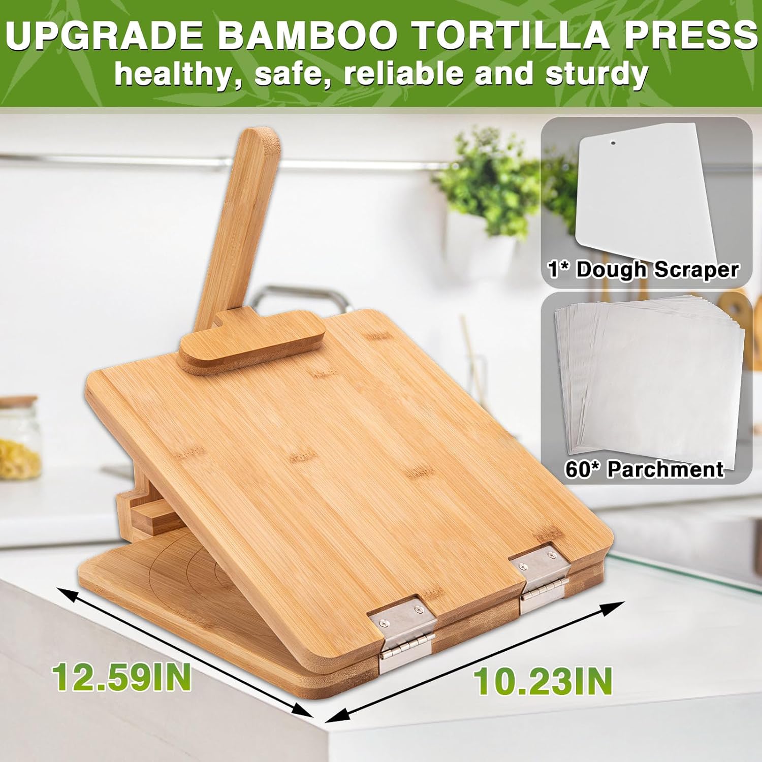 Upgraded Bamboo Wooden Tortilla Press – 10 Inch Square Wood Tortilla Maker Press with 60 Pcs Parchment Paper & Scraper, 4.5” to 10″ Mexican Tortillera Presser for Homemade Tortillas, Pataconera