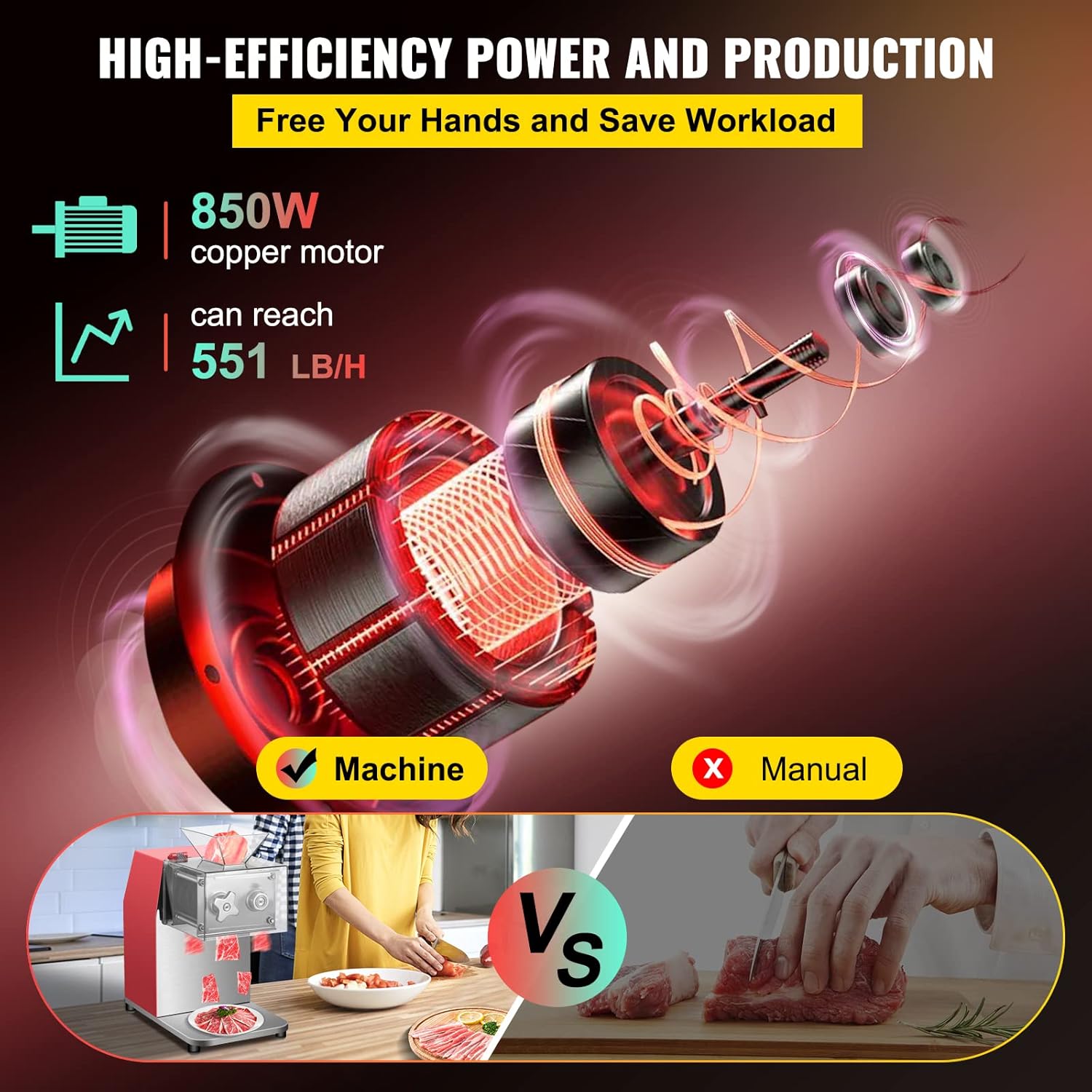 VEVOR Commercial Meat Cutting Machine, 551 Lbs/H 850W Meat Shredding Machine, 3.5mm Blade Electric Meat Cutter, Stainless Steel Restaurant Food Cutter, for Kitchen Supermarket Lamb Beef Chicken, Red