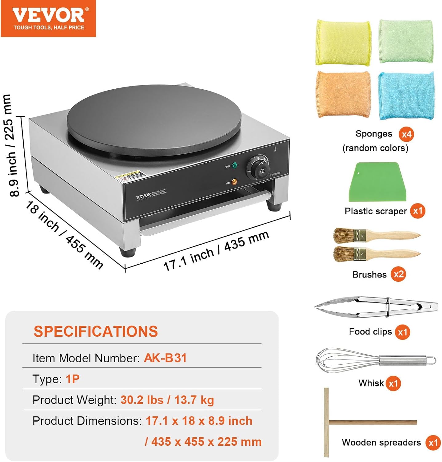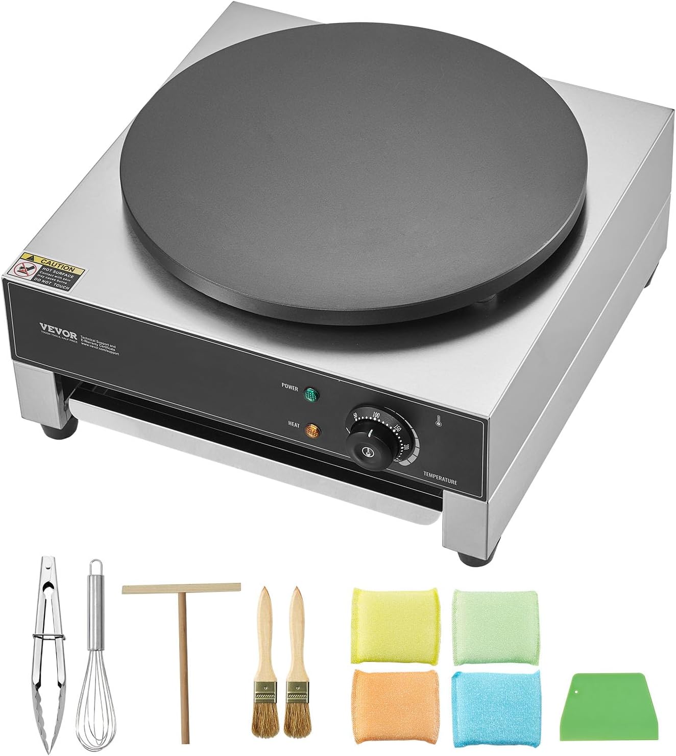 Carefully Designed Details: Made of stainless steel, with four rubber feet on the bottom to enhance stability during operation and keep it steady. This pancake making machine also comes equipped with a variety of accessories to aid in baking.