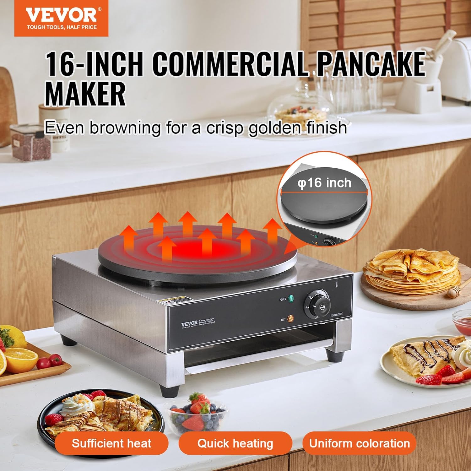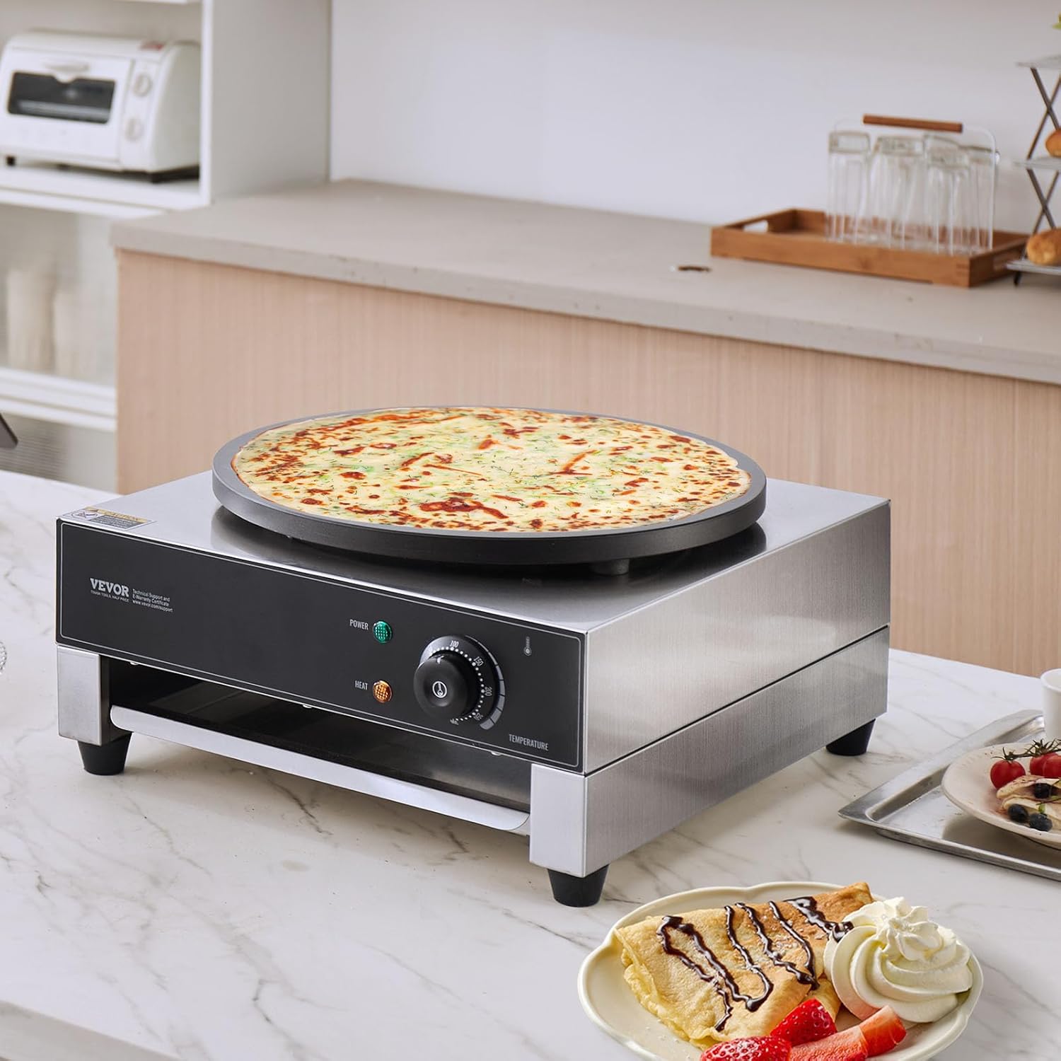 VEVOR Electric Crepe Maker, 16-Inch Commercial Crepe Machine, 1700W Flat Plate Crepe Griddle, Nonstick Stainless Steel Pancake Making Machine, Desktop Circular Cereals Pancake Stove with Temp Control