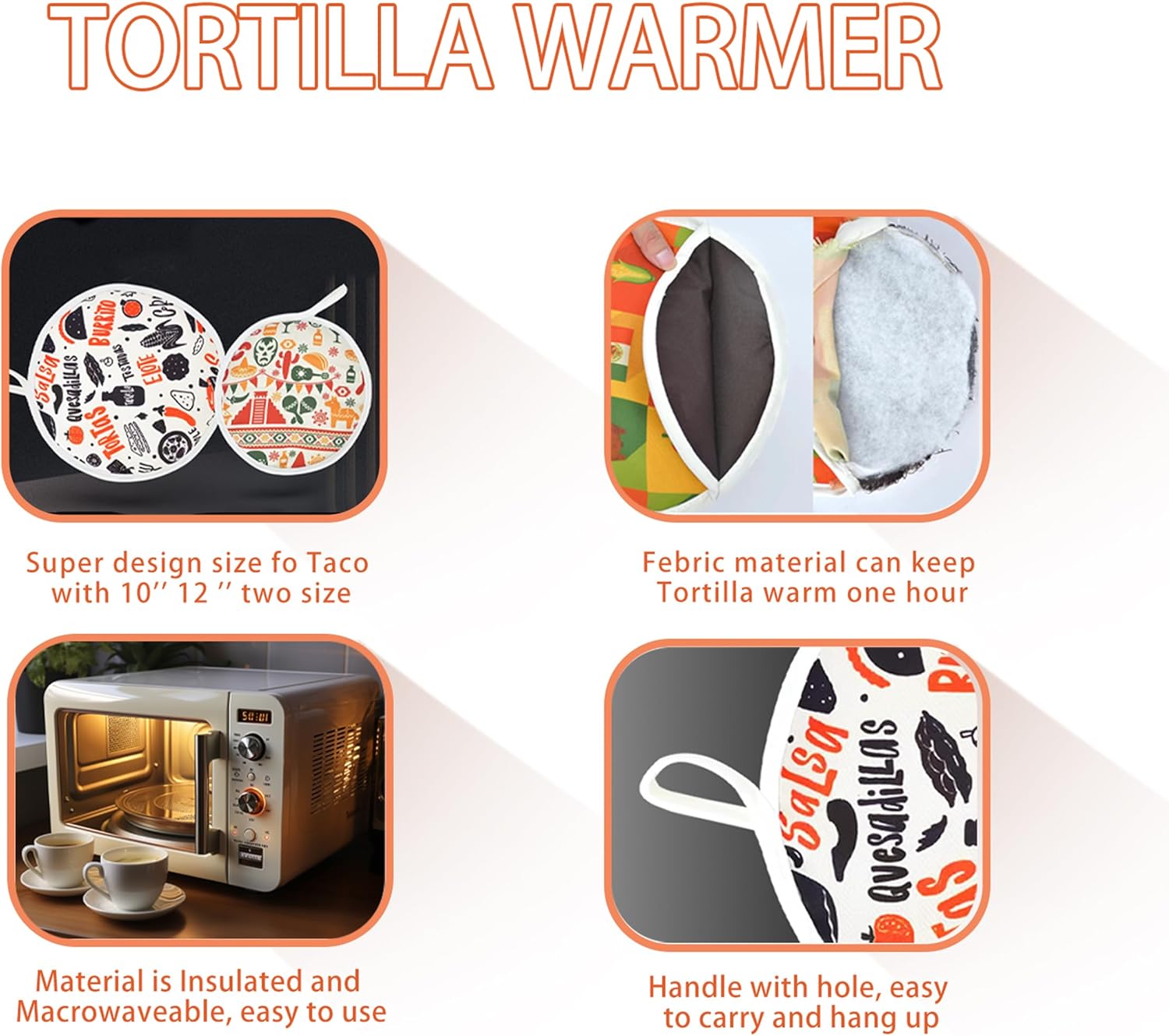 🌮 2 Sizes for Any Occasion Includes 10-inch and 12-inch warmers—great for tacos, burritos, and pita bread Incluye dos tamaños: 10 y 12 pulgadas, ideal para tacos, burritos y más