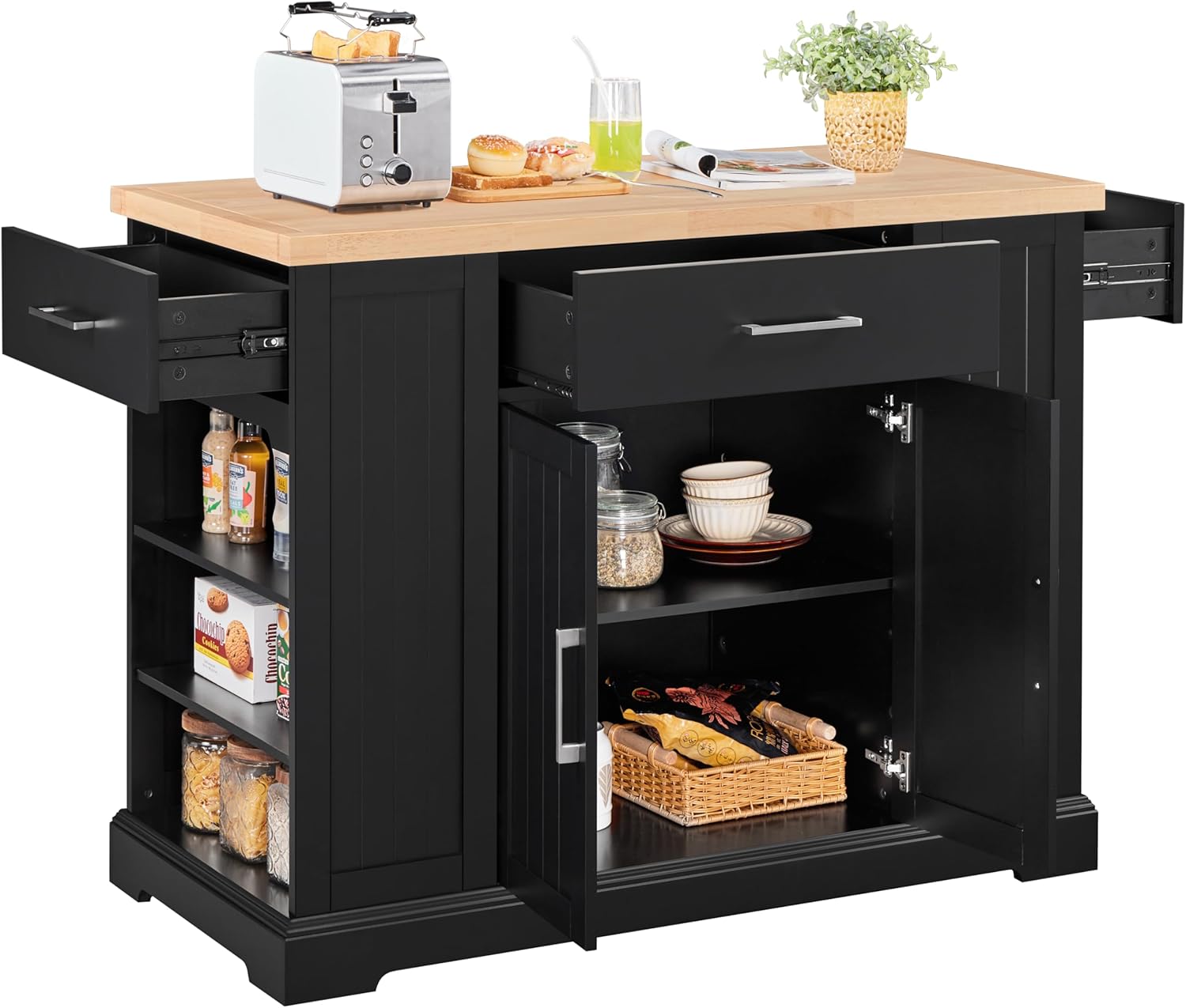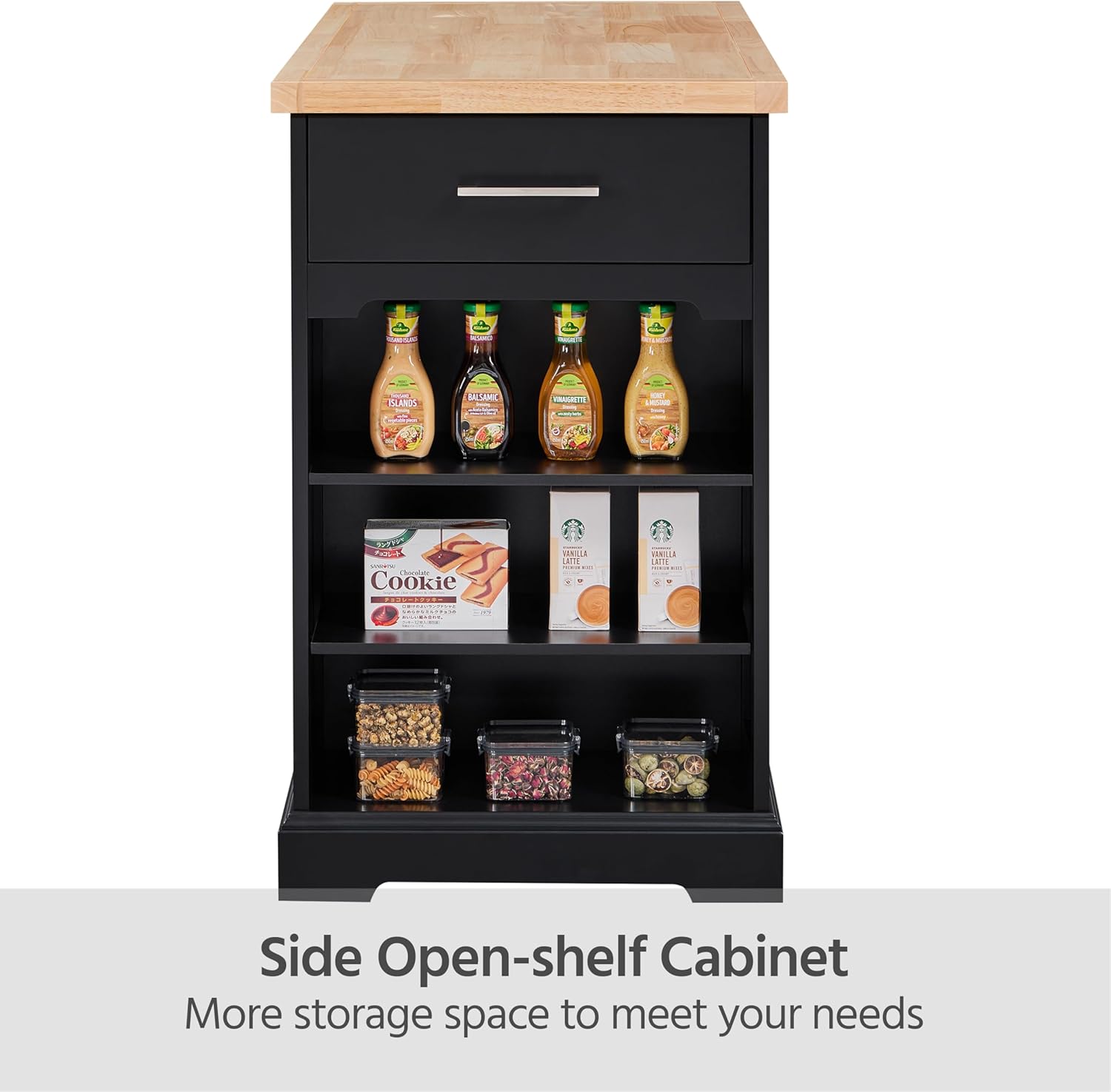 Ultra-Large Capacity: Featuring a wide desktop, a big drawer, 2 side drawers, a double-door cabinet, and 2 side open-shelf cabinets, this utility kitchen island cart provides super-large storage space for all the essentials. The kitchen organizer can hold up to 230 kg / 507 lb in total, and the maximum load capacity of the counter space is 80 kg / 176 lb.