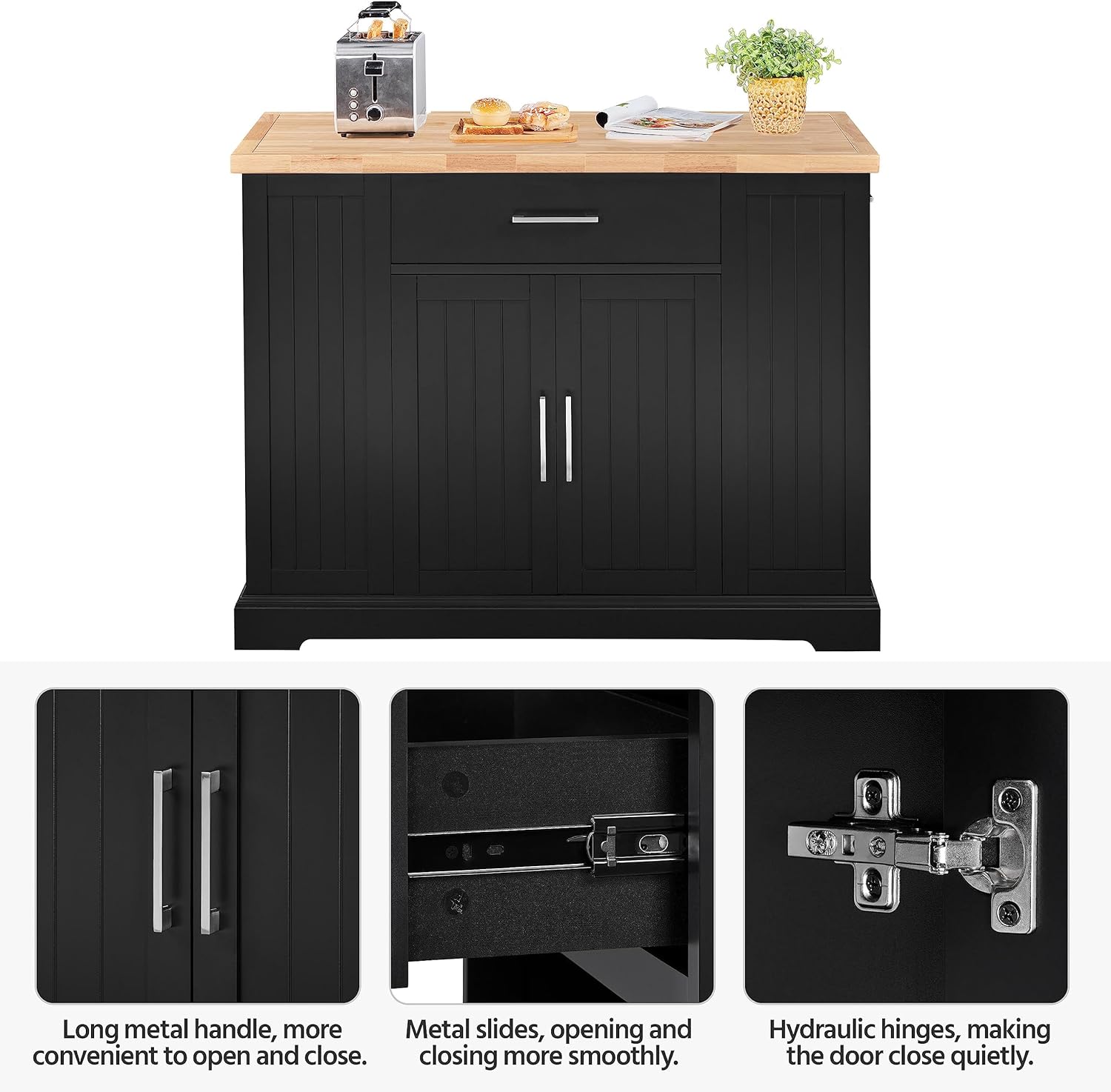 Make Kitchen Items At Handy: A wide countertop to store kitchen appliances like coffee makers and air fryers or snacks. A roomy drawer on full extension metal slides offers out-of-sight storage for daily-used culinary tools like plates and silverware; 2 side drawers can hold small-sized kitchenware like knives and napkins; the double-door cabinet and side open shelves store your food, bottles, and jars neatly.