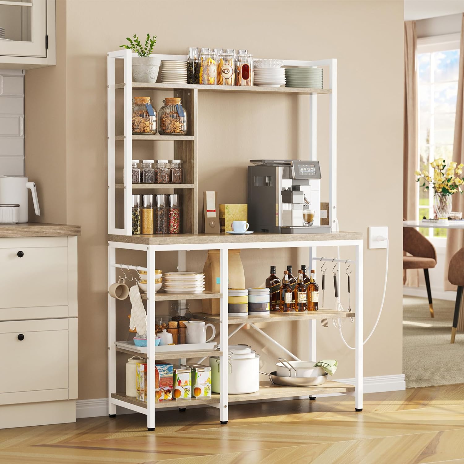 [ Modern Style ] – Boasting its oak wooden grain and white metal frame, this baker’s rack is stylish to fits in any home decor, always showing its unique character as freestanding coffee bar station, pantry storage shelves, kitchen & dining room organization rack;
